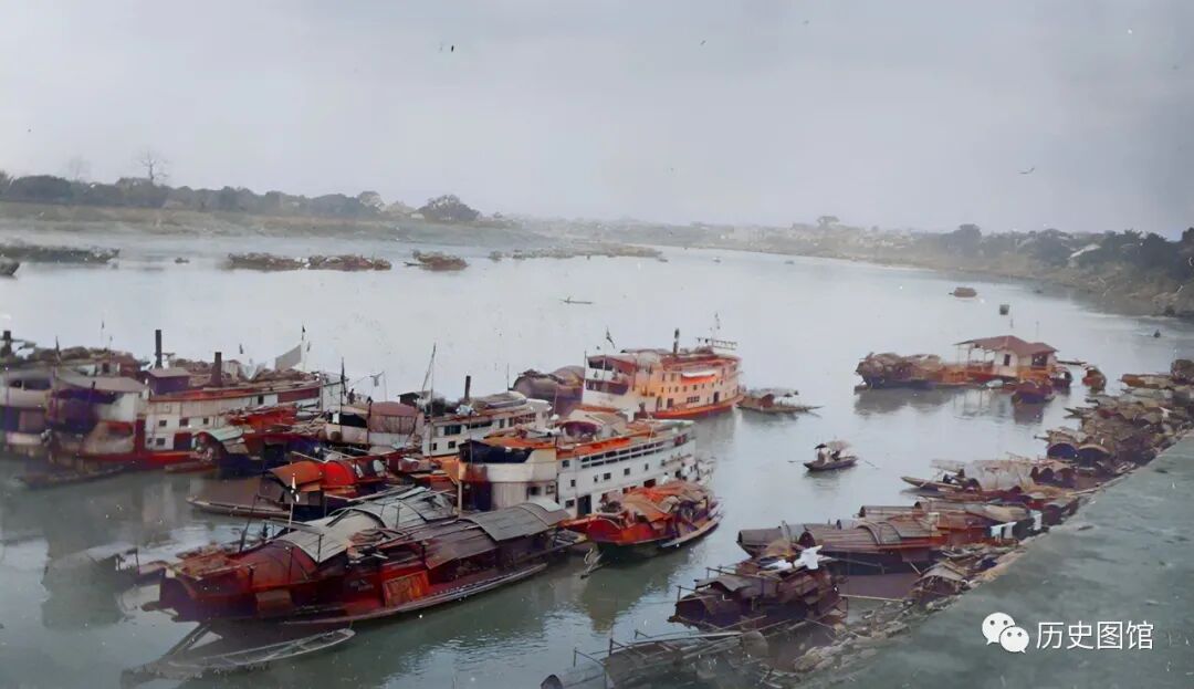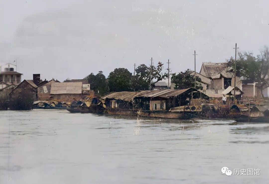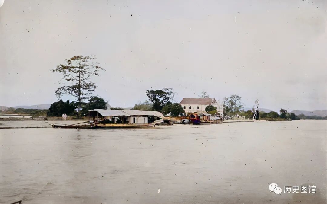 1915年,广西南宁西江风光。这是一座江边小镇,建筑古色古香。江边是一座码头,几艘带棚子的船停靠在岸边,显得很静谧。
