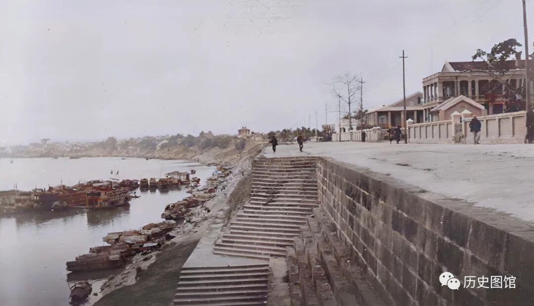 外滩的堤岸,用石头垒砌加固,并修建有几十级台阶,方便人们上下码头。岸上的欧式建筑,是一家大型的外贸公司。