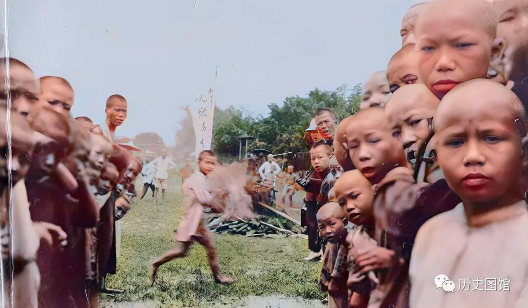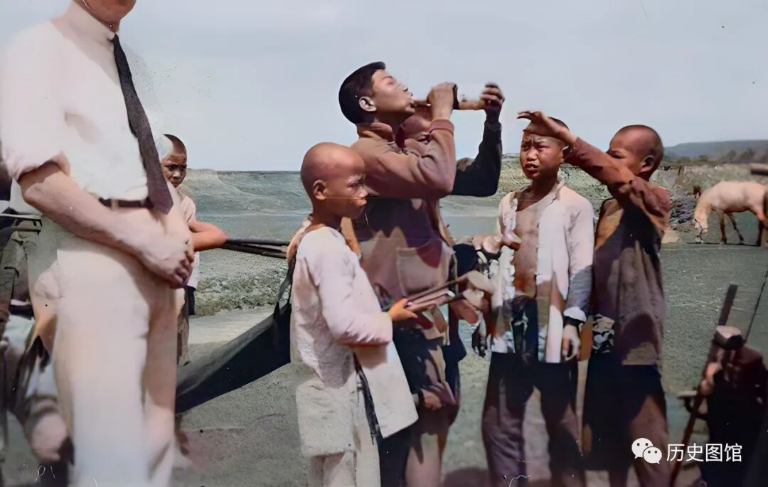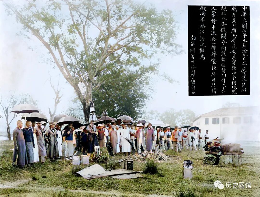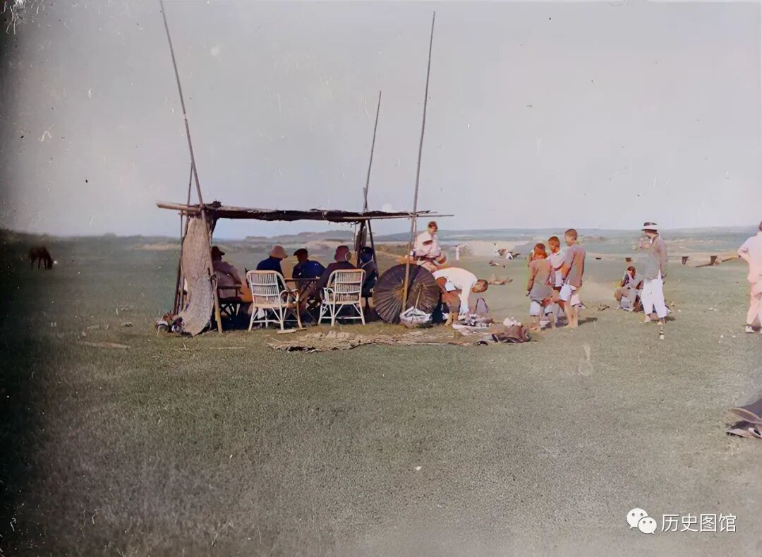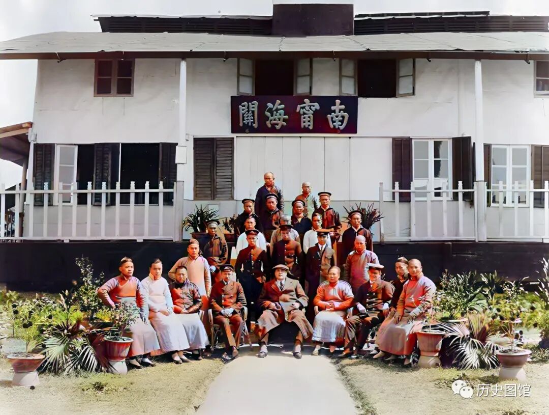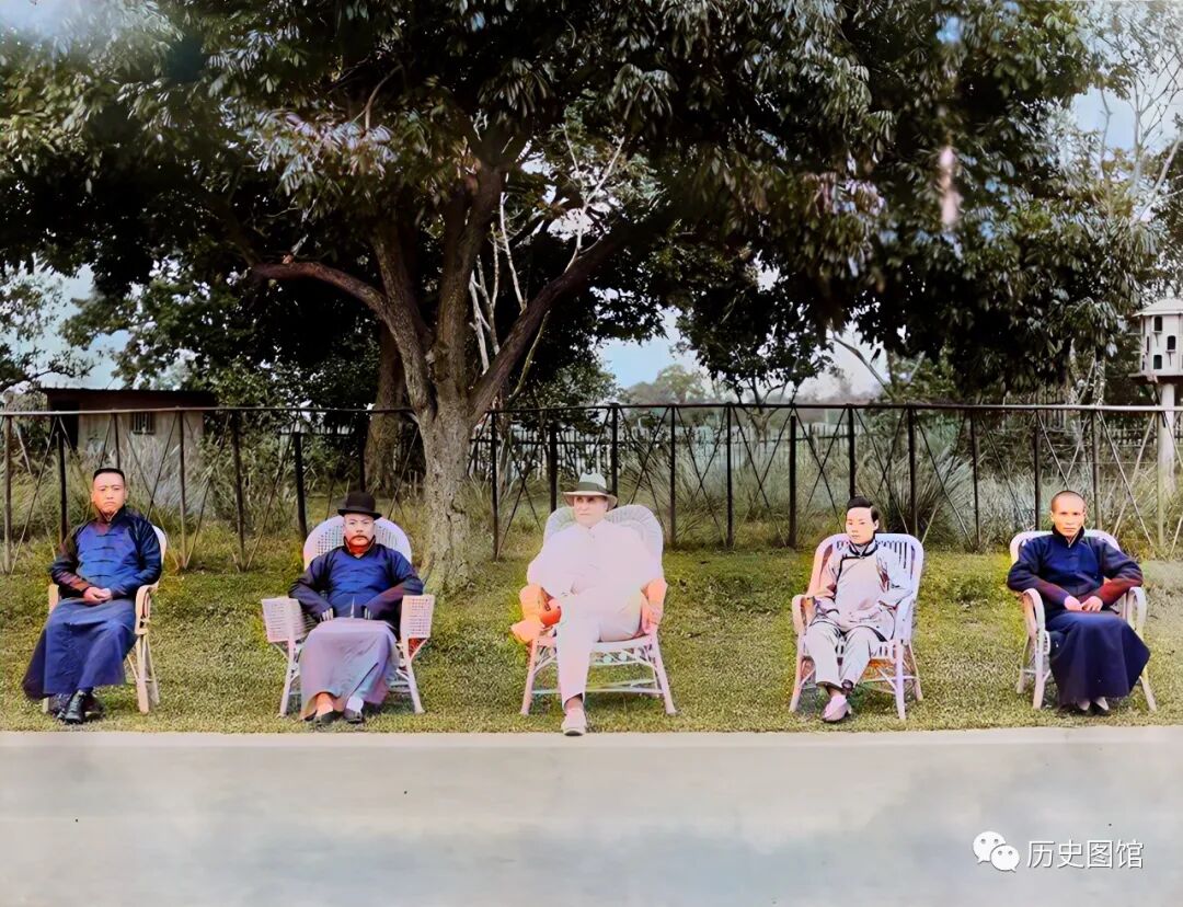 1915年,海关专员赫奇兰邀请几名当地官员到自己家里,他们一字排开,坐在一棵大树下面,摄影师拍下了这张照片,几个人的表情各异。