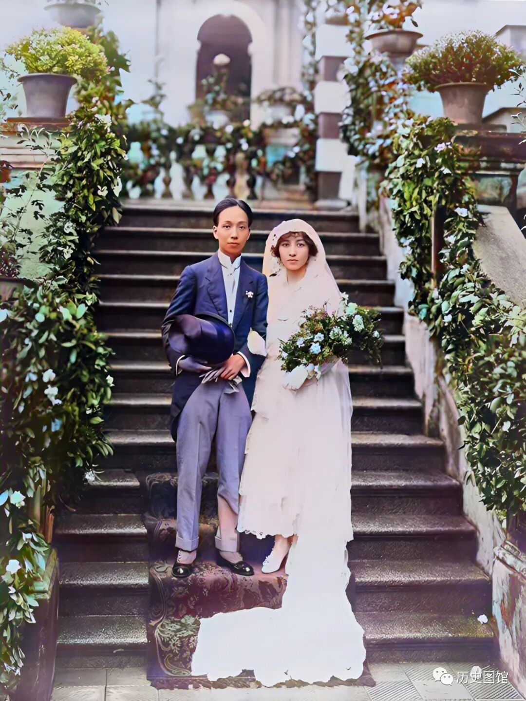 1915年,一名叫永乐伟的男子,和自己新婚妻子的合影照。他们举办的事一场西式婚礼。新郎穿着笔挺的燕尾服,新娘穿着洁白的婚纱。台阶上铺着地摊,栏杆上装饰着各种花卉。