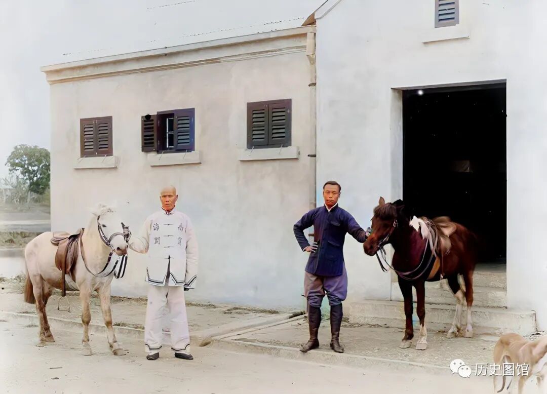 照片中这两名男子,是海关的后勤人员。他们身穿南宁海关的制服,两人各牵着一匹马。他们背后的这座建筑是马厩。