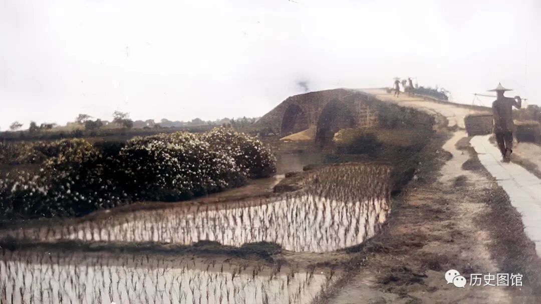 这是南宁郊外的景象。在一条小河上,横跨着一座老旧的石拱桥。这座桥看上去相当有年头了,路面上铺着青石板,几名挑着担子的人从桥上走过。
