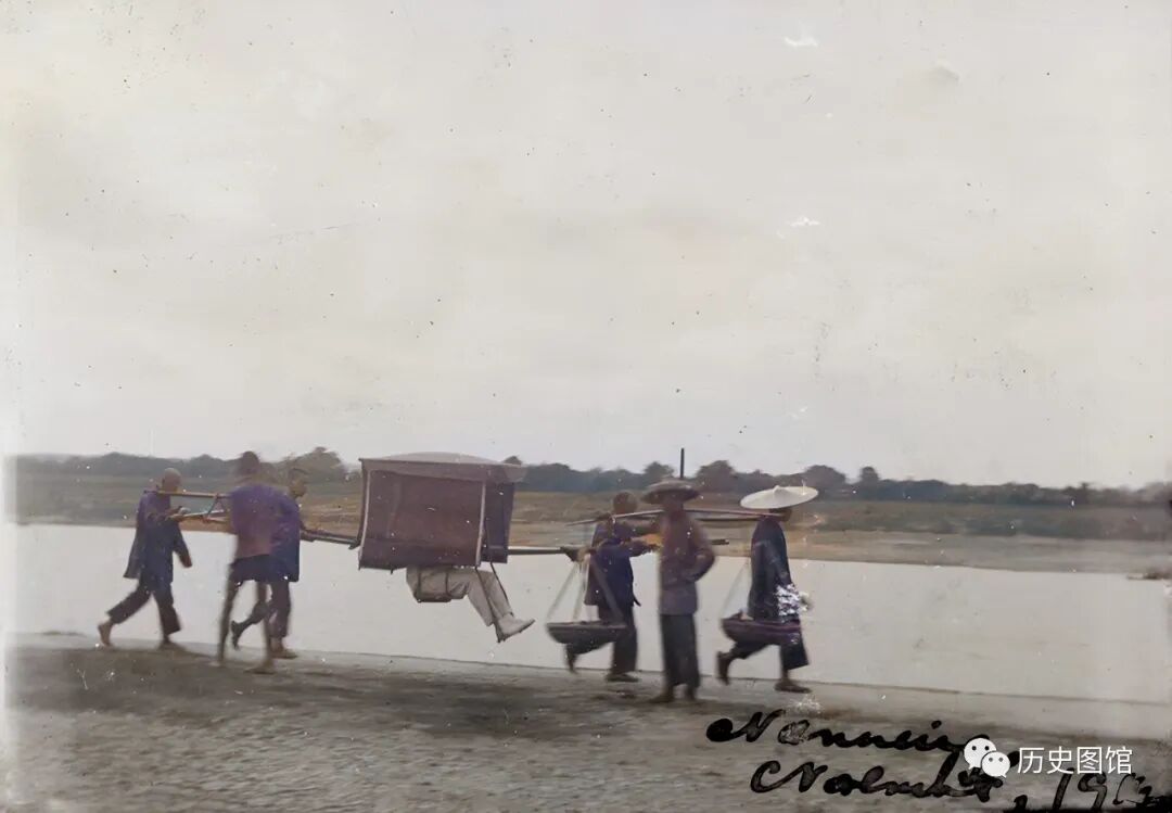 照片中,四名年轻力壮的轿夫正抬着轿子前行,他们相互配合默契,走起路来一点也不慢。旁边两名挑着担子的也是当地人,两人头上戴着硕大的斗笠从去赶早市。