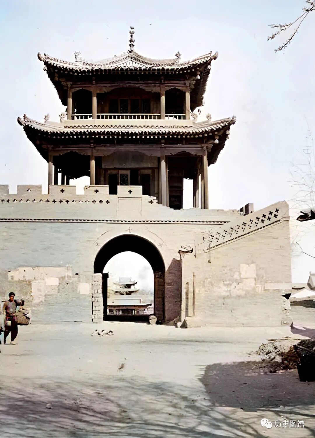 由于年代久远,塔楼的垛口有的地方已经坍塌。一名挑着扁担的男子从塔楼旁经过。