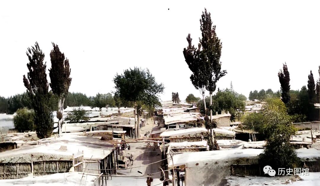 1910年,新疆阿克苏新城景象。一条小街道两旁,整齐排列着很多民房,高大的杨树点缀其间。街道上行人并不多。