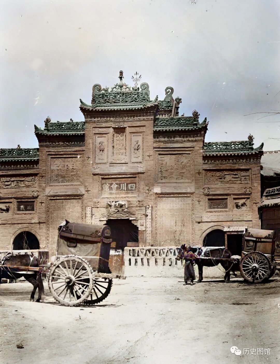 这是位于乌鲁木齐的四川会馆。高大的牌楼,装饰有精美的砖雕,飞檐高挑十分壮观,门楣上“四川会馆”四个大字分外醒目。门前两辆马车正在等待载客。
