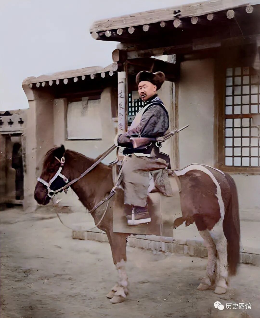 1910年,新疆伊犁地区边防部队的一名将官,骑在马上正准备出去巡逻。他身穿戎装头戴棉帽,背着一支步枪,威风凛凛。后面的建筑,应该是边防站,条件还是有些简陋。