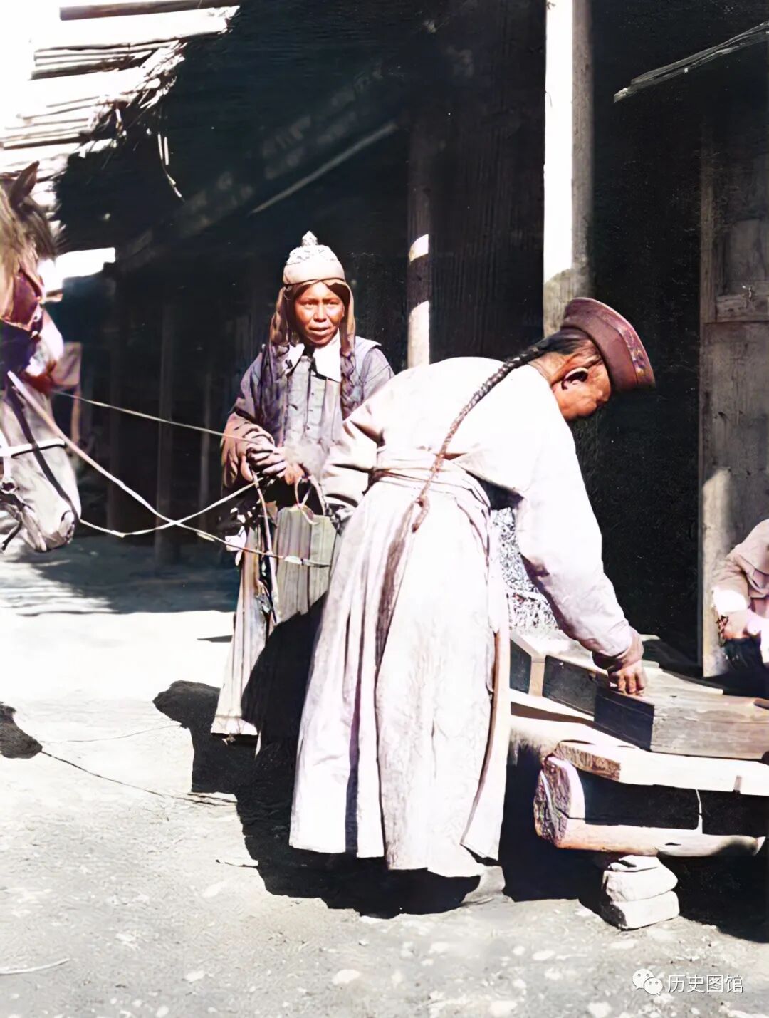 1910年,宁远(今伊宁)街头景象。照片中,两名蒙古人骑着马来到街上购物。他们在一个路边摊挑选商品。他们身上的蒙古服饰很有特色,与当地维族人服装有明显的不同。