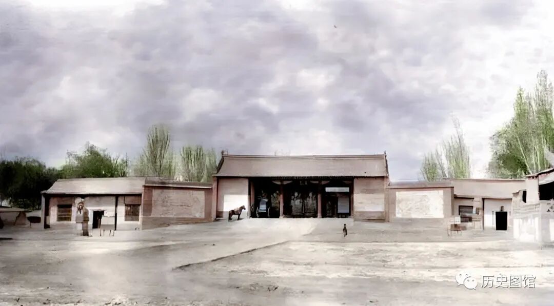 1910年,乌鲁木齐的巡抚衙门,位于现在的人民广场一带。正大门面阔三间,门里停有一辆专用马车,门口笔直的官道铺着地砖。