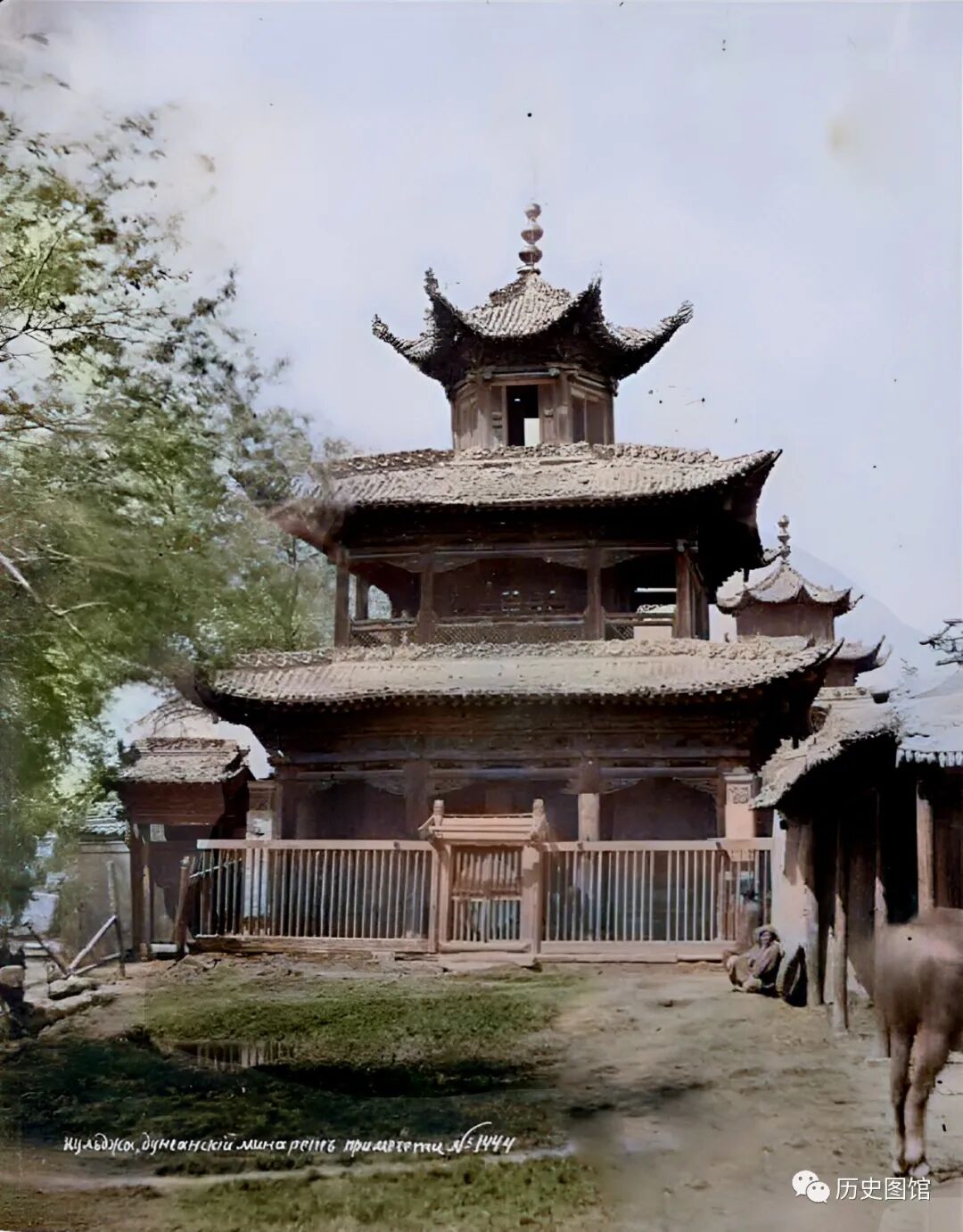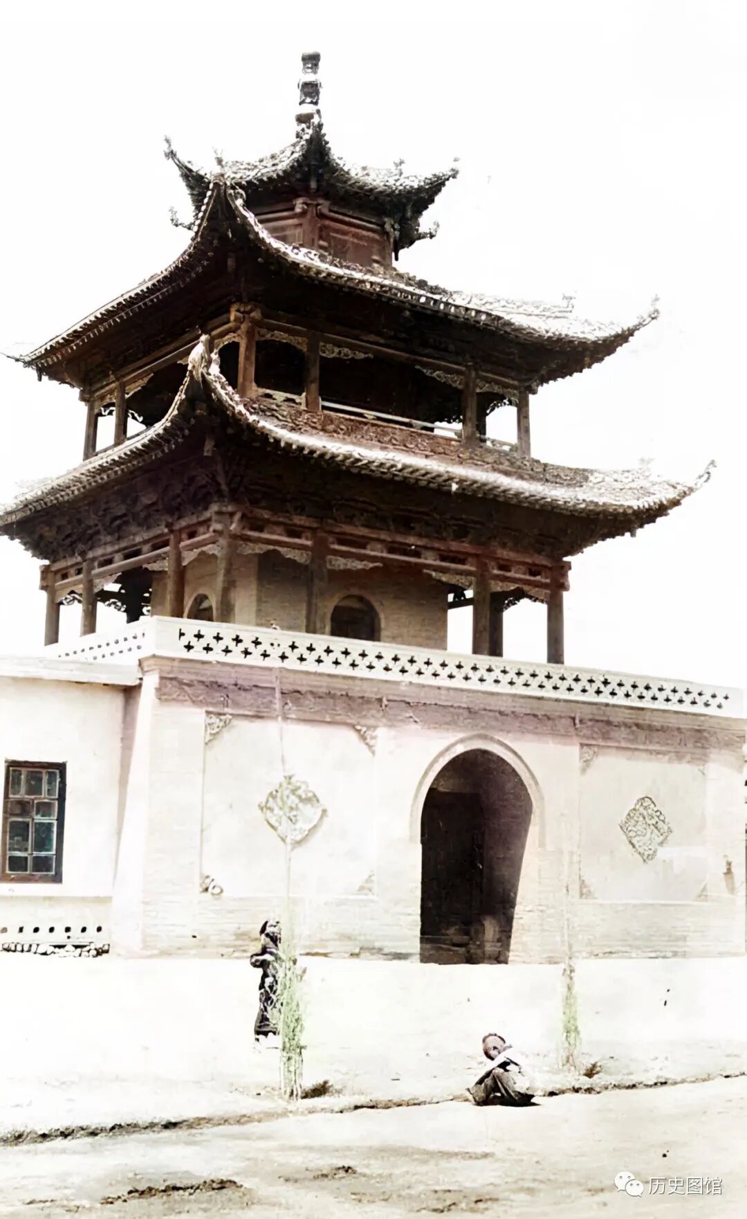 1910年,新疆宁远鼓楼面貌。宁远,也就是现在的伊宁。鼓楼始建于明英宗正统八年(1443年),雄伟壮观。鼓楼前有一名小孩在玩耍。