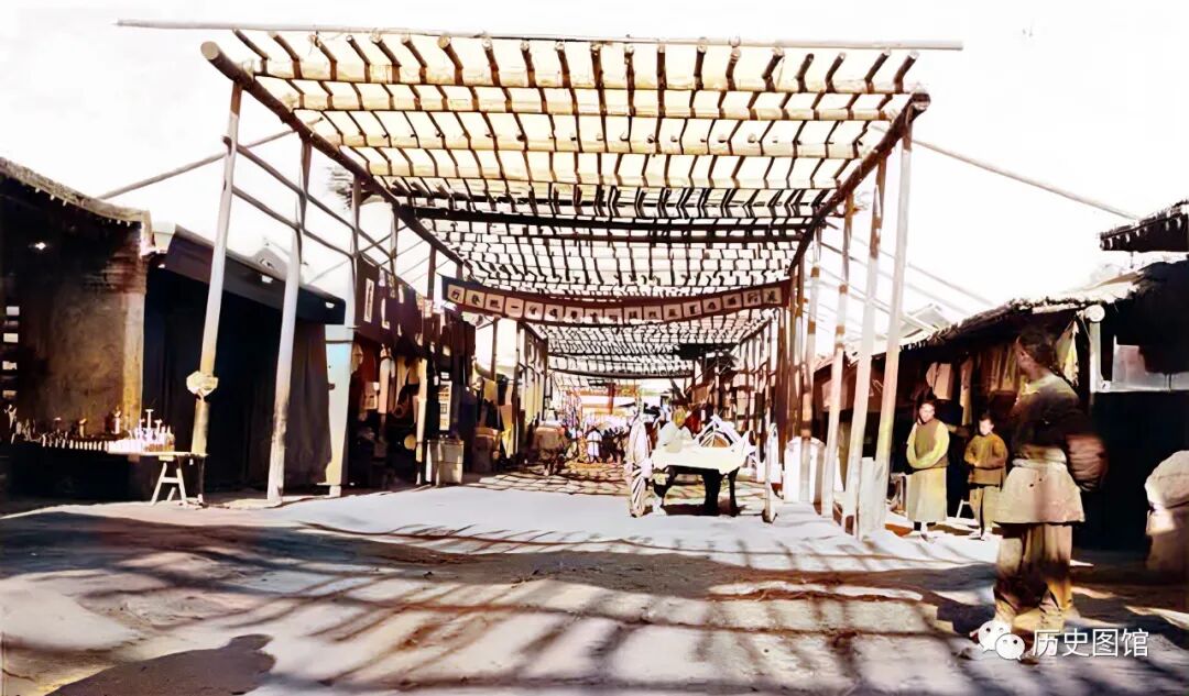 这是新疆古城子的主街道。古城子,也就是现在的奇台。街道宽阔,中间建有遮阳棚。