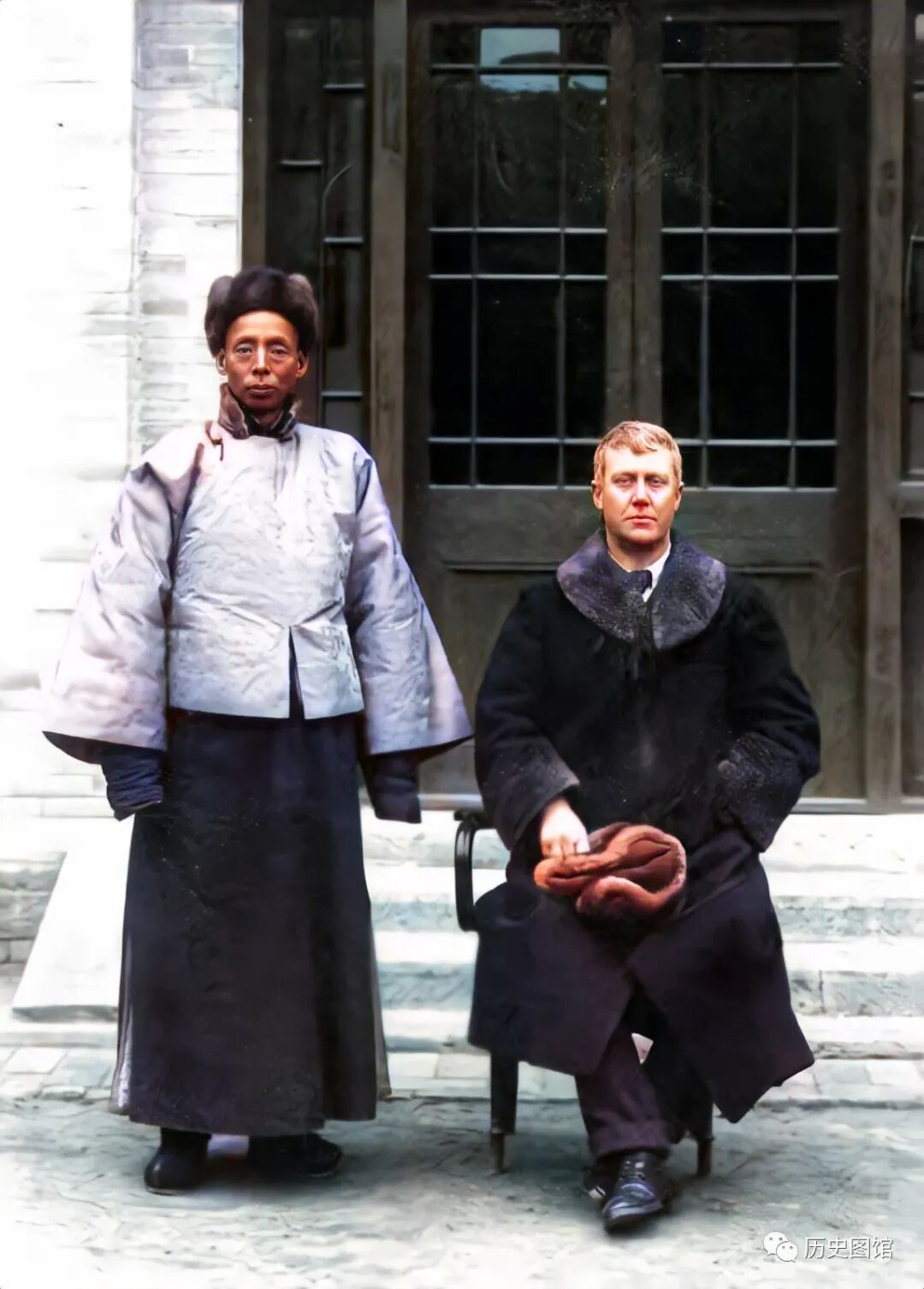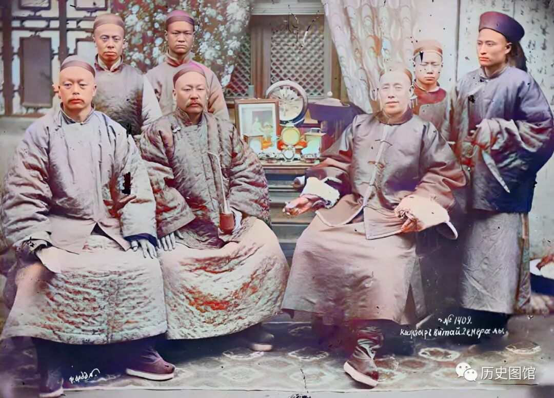 这张照片拍摄于新疆喀什。照片中这几个人,是镇守喀什的边疆大员。他们身穿棉袍,正坐在一起商议军机大事。