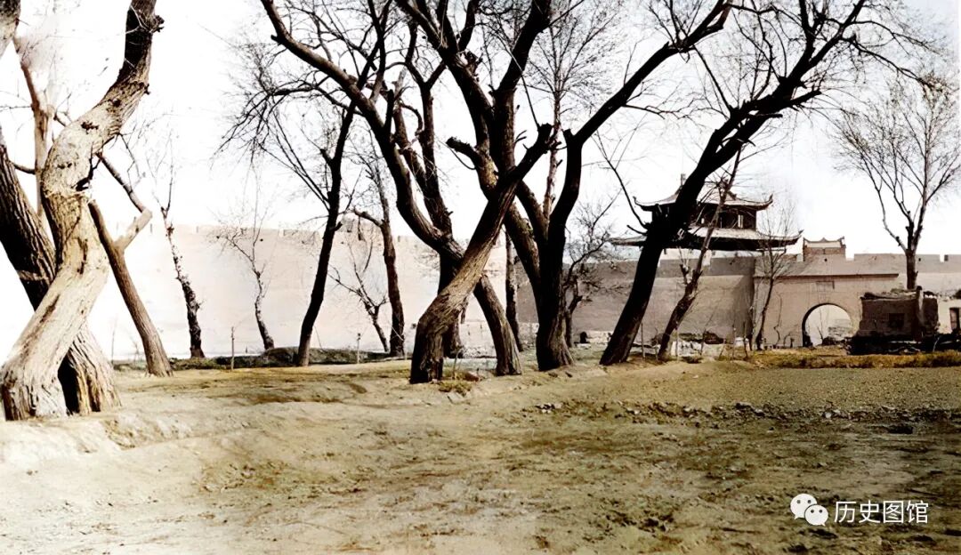 1910年,乌鲁木齐满城西门景象。乌鲁木齐最大的满城叫巩宁城,也叫老满城。满城周长九里三分,设城门四座:承羲(东)、宜穑(西)、轨同(南)、枢正(北)。