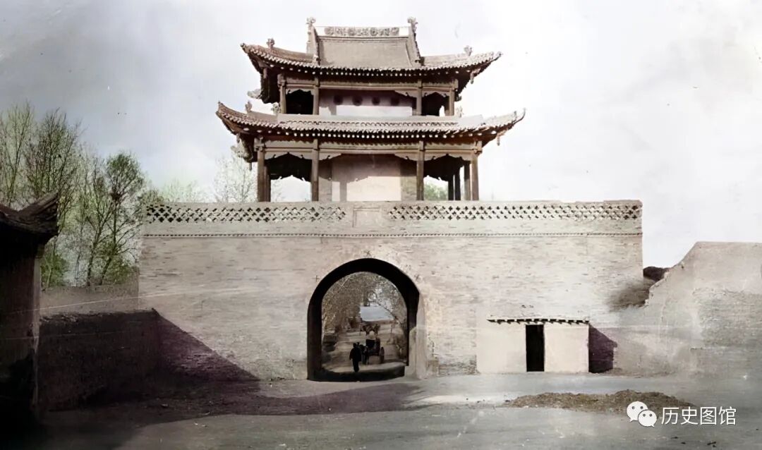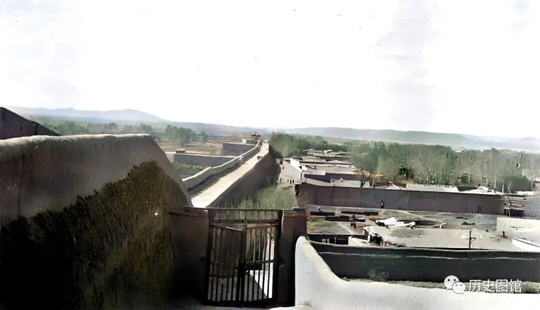 清朝末年,新疆乌鲁木齐南城墙景象。站在城墙上远眺,城墙高大厚实,城墙外面设有敌台。城内民居建筑栉比鳞次。从这里登上城墙,需要穿过一个小铁门。