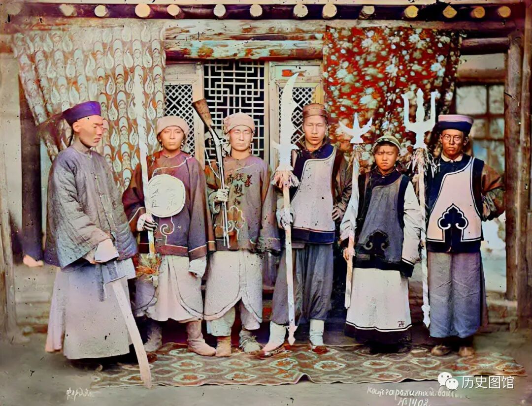 1910年。新疆喀什的清军士兵。站在最左侧的是一名军官,手拿一把大刀。五名士兵站成一排,手里拿着五种不同的武器。其中一名士兵,握着枪管,枪口朝下,看上去一点都不专业。