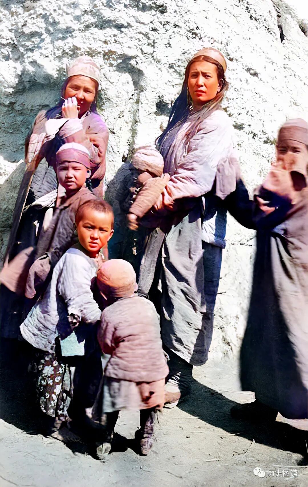 1910年,新疆哈密的两名维族妇女,带着孩子在路边晒太阳。新疆维吾尔族人的服饰花样特点较多,富有特色非常优美。