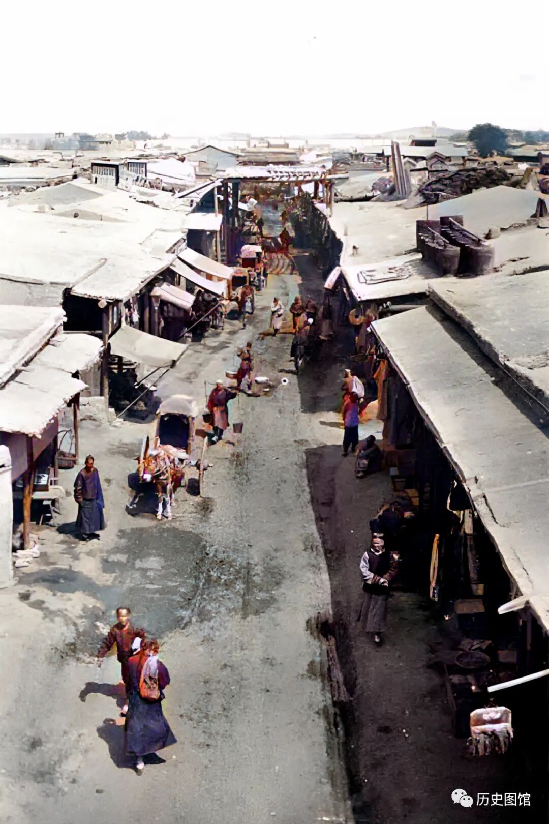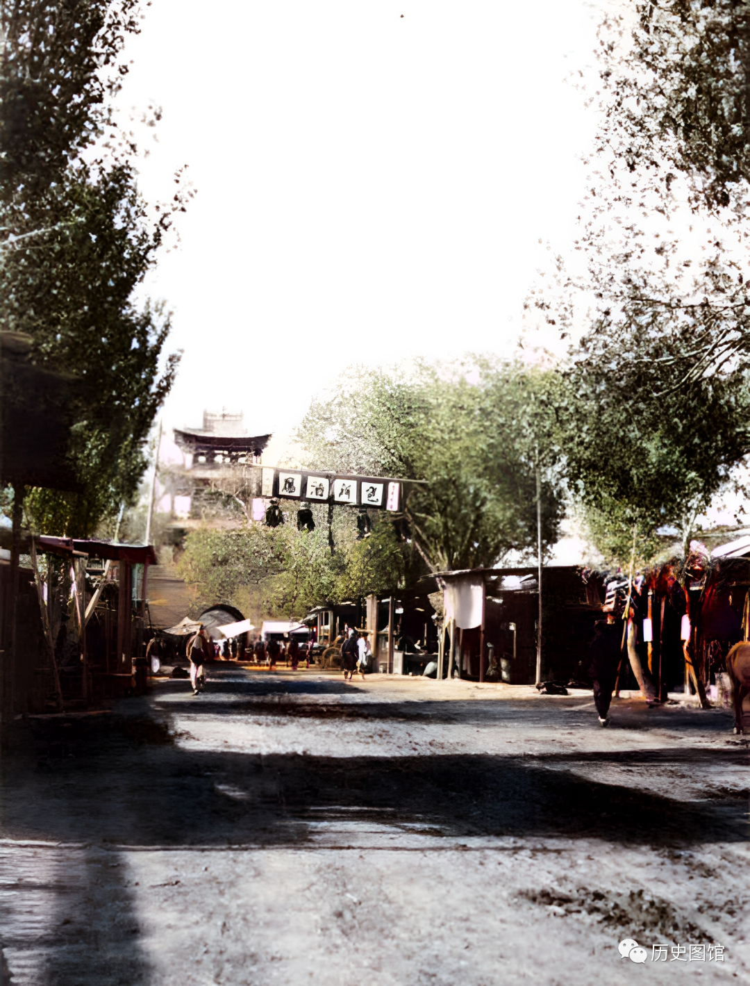 1910年,新疆乌鲁木齐南城门附近的景象。这是一条繁华热闹的街道,沿街店铺都在开门营业。街上人来人往,两侧是具有当地特色的传统建筑,古色古香。