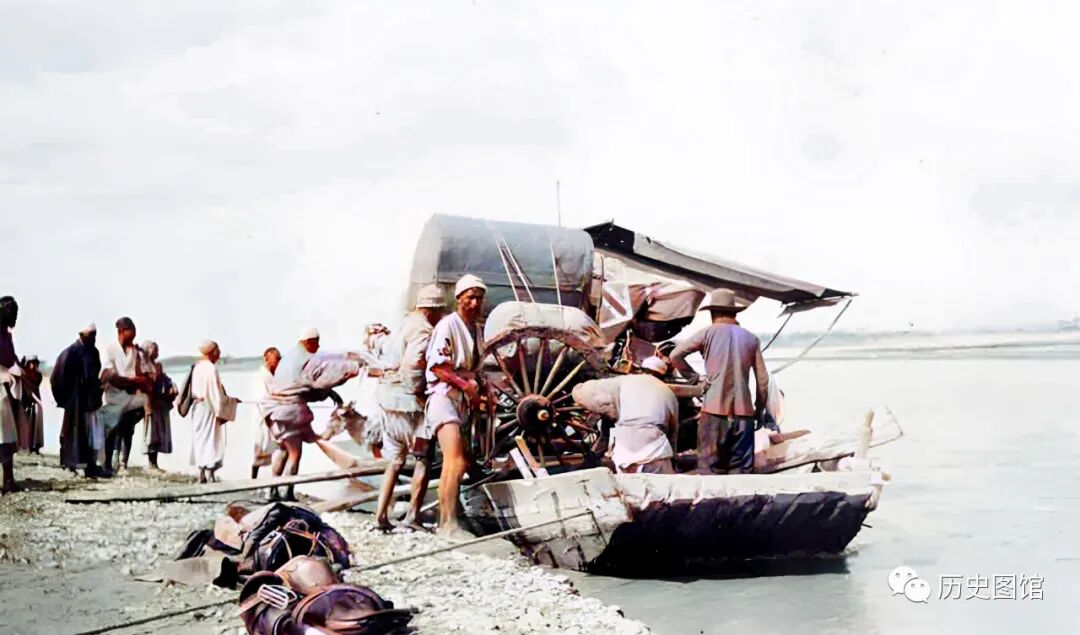1910年,新疆阿克苏河的一个摆渡口景象。船只停靠在岸边,乘客正在登船,船上已经装满了各种货物。"阿克苏"意为"白水",有昆马立克河与托什干河两源。