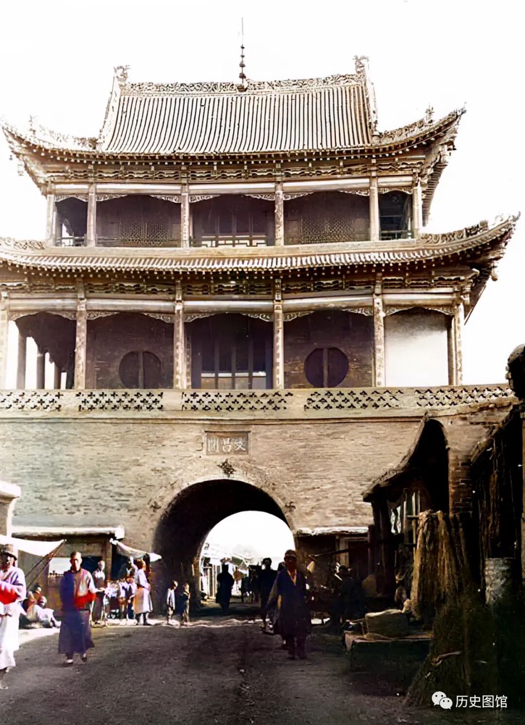 这是位于乌鲁木齐南关文昌阁。拱形门洞下是一条宽阔的街道。街道两侧都是店铺,都在开张营业,文昌阁前人来人往。