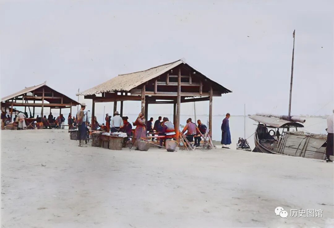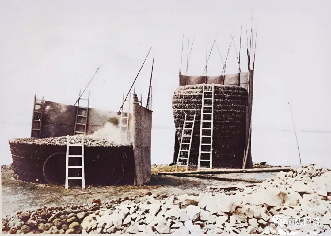 照片中这两座装置是石灰窑,位于河岸之上。石灰是重要的建筑材料,手工烧制石灰在当时很普遍。