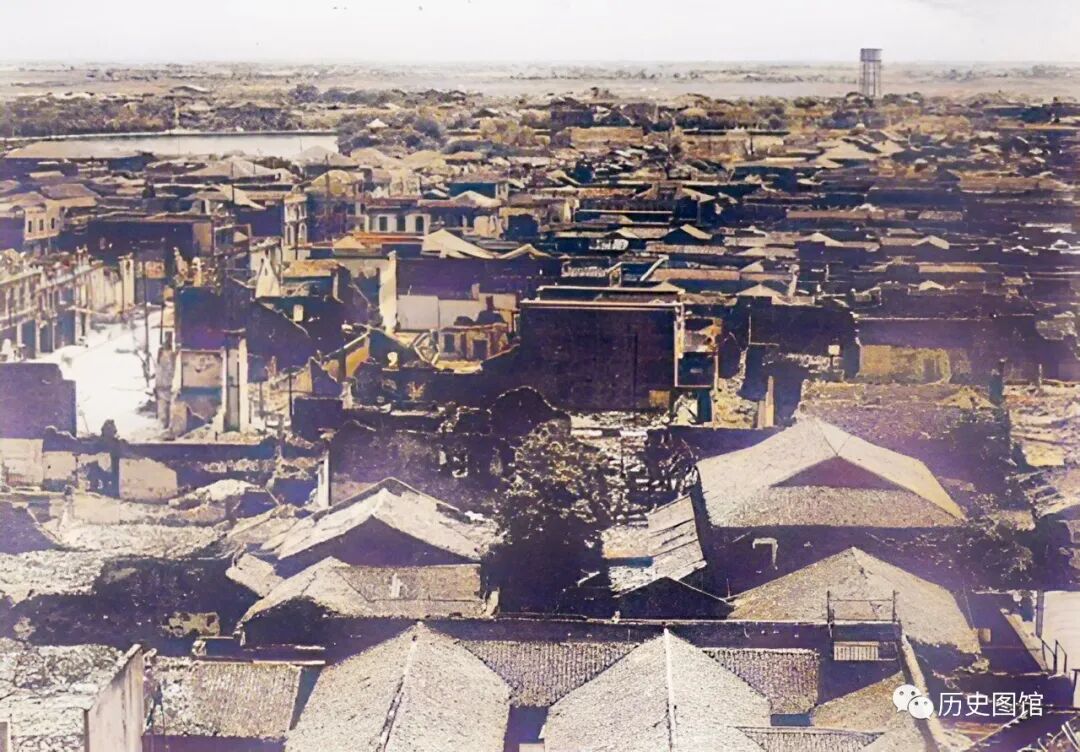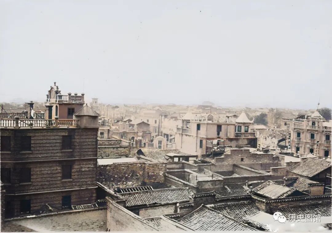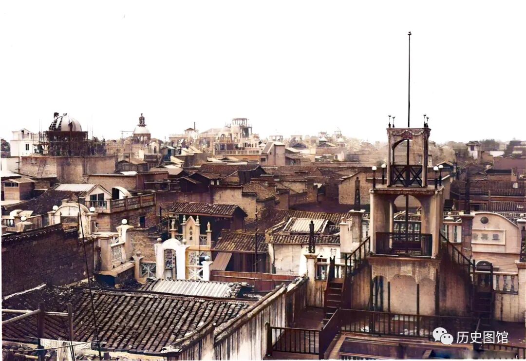 这张照片拍摄于1930年,位置位于中山路附近的南昌街巷。从这个角度放眼望去,在大面积古色古香的中式建筑群里,点缀着一些欧式建筑,高耸的圆顶塔楼,直插云霄。