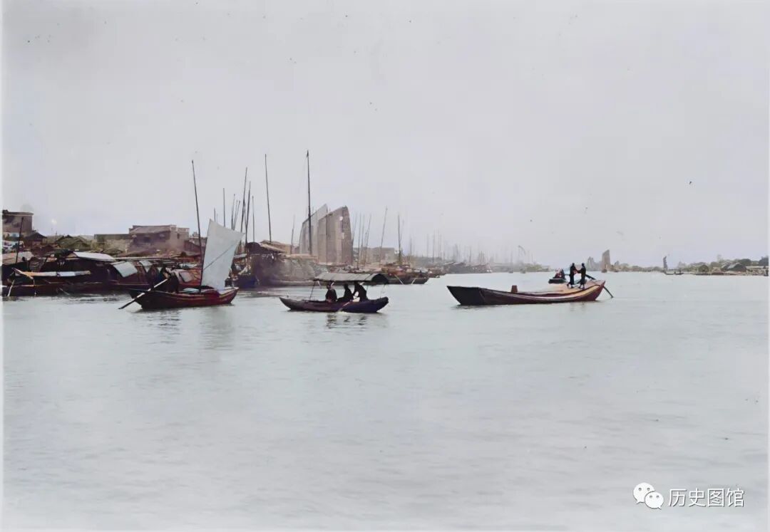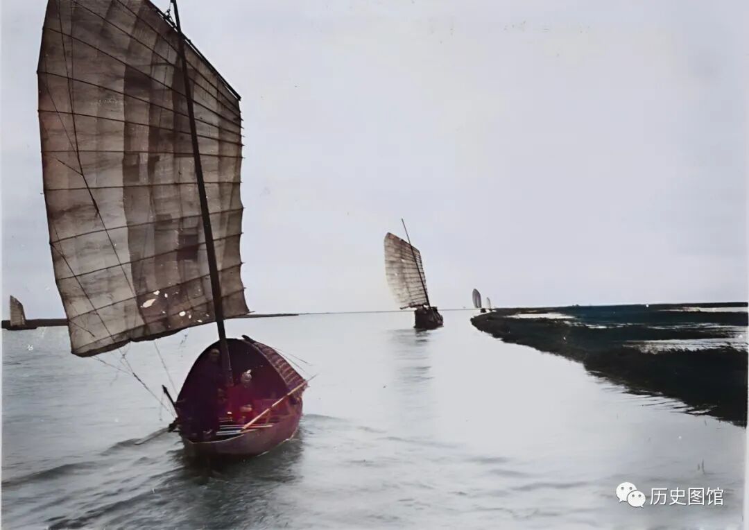 1939年,美丽的赣江风光。画面中,几艘帆船正驶往远方,耳边似乎能听到烈烈的风声。岸边水草丰美,犹如一幅水彩画。
