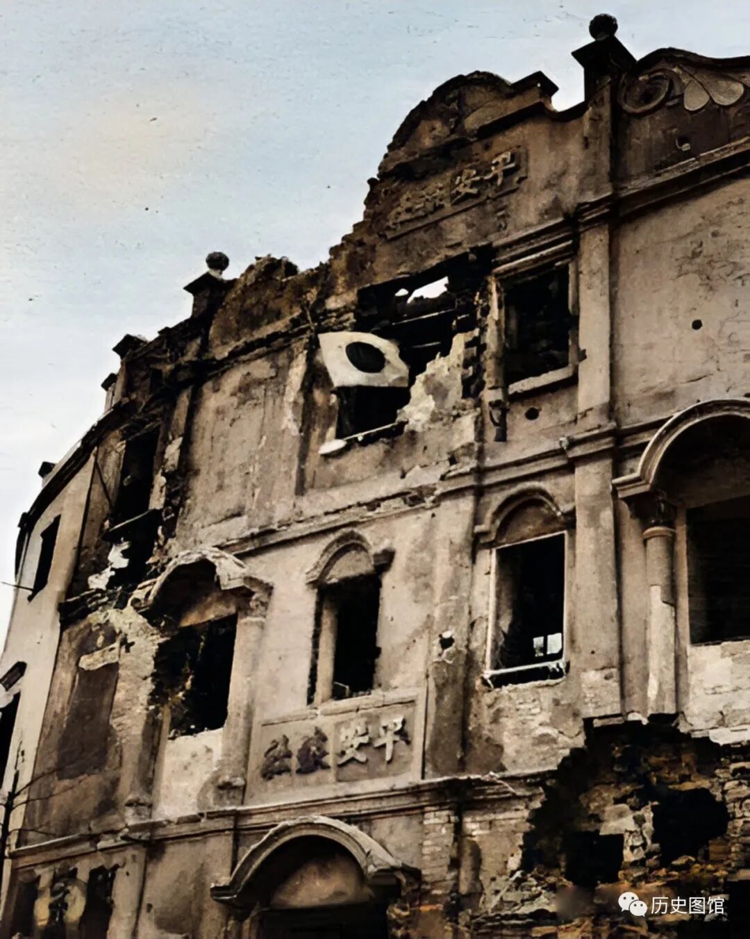 被日军炮火炸毁的南昌平安旅社,墙壁上炮弹炸出两个大洞,窗户和玻璃全部被炸飞。楼顶上也有被大火焚烧过留下的黑色痕迹。