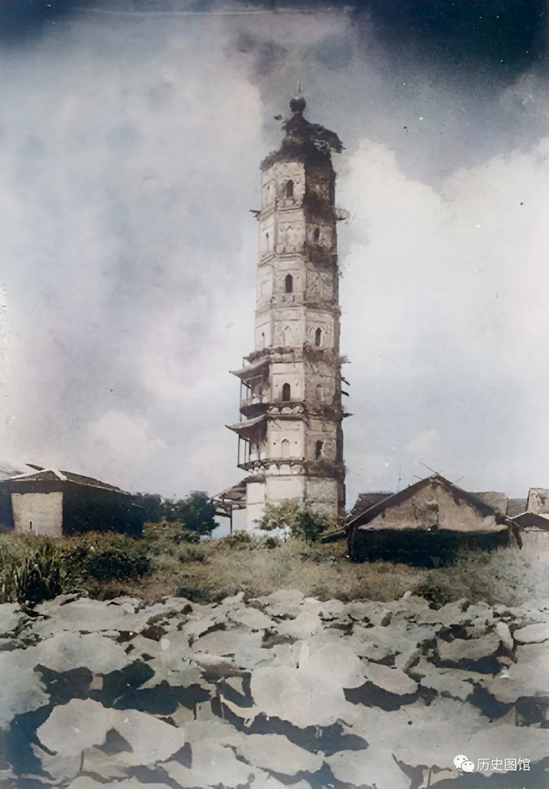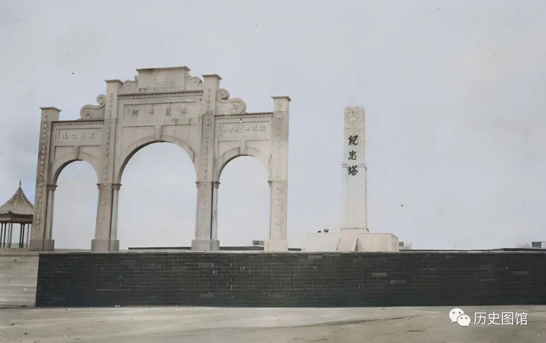 30年代,南昌北伐纪忠塔。塔身为四方柱形,下面有底座。塔身上“纪忠塔”三个大字格外醒目。在纪忠塔塔的旁边,有一座石牌坊。