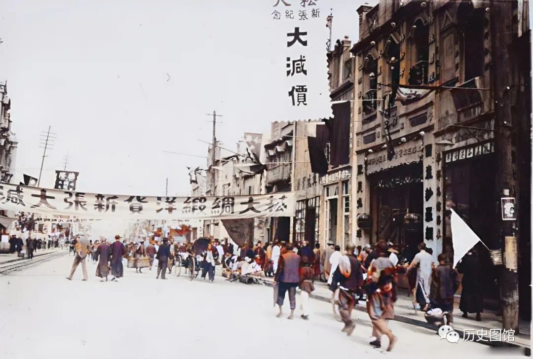 街道上的行人熙熙攘攘,有的骑车,有的挑着担子,有的驾驶马车,黄包车师傅也在路边等待载客。整条大街,商业氛围浓郁。也反映了当时南昌的繁荣景象。