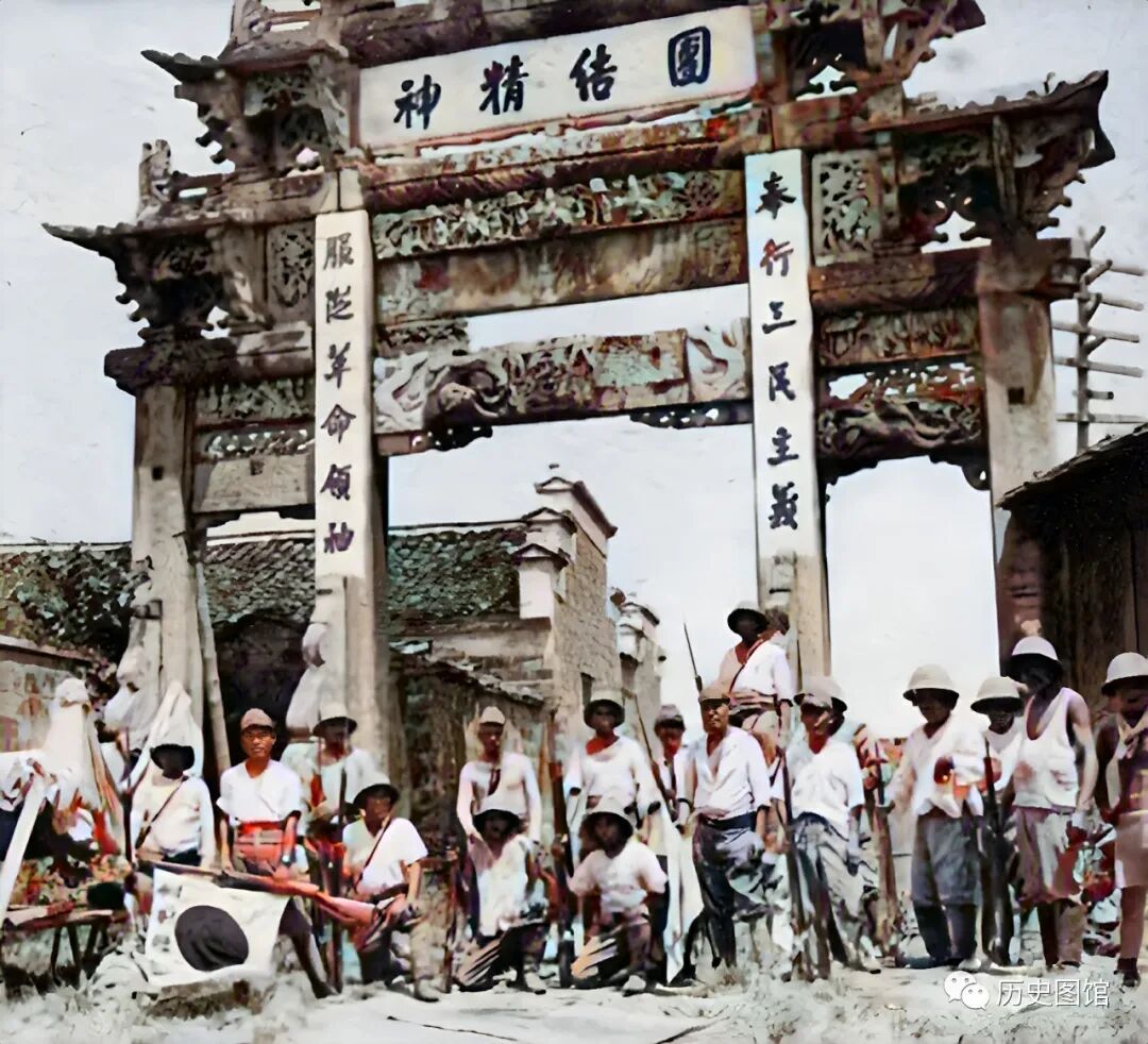 1939年,一群日军来到星子县城,在写有抗战标语的牌坊下合影。牌坊上一副对联,非常有时代特色。