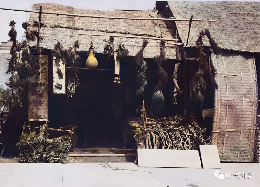 这张照片拍摄于1930年,这里是位于南昌中山路公安局附近的一个中药铺。这间药铺很简陋,房顶用竹席覆盖。药铺门口摆放着各种中草药。
