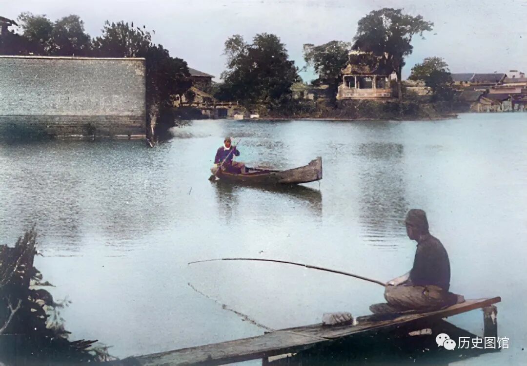30年代,一名日军坐在西湖边上的木栈道上钓鱼。远处,还有一名日军正在悠闲地划着小船。西湖周围,再也看不到有其他人。
