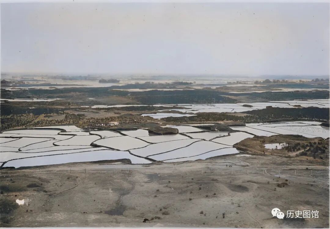 1939年,南昌城外的田野风光。放眼望去有大片的稻田,犹如一块块不规则的镜子,水天一色。在一些旱地上,也种植有农作物。