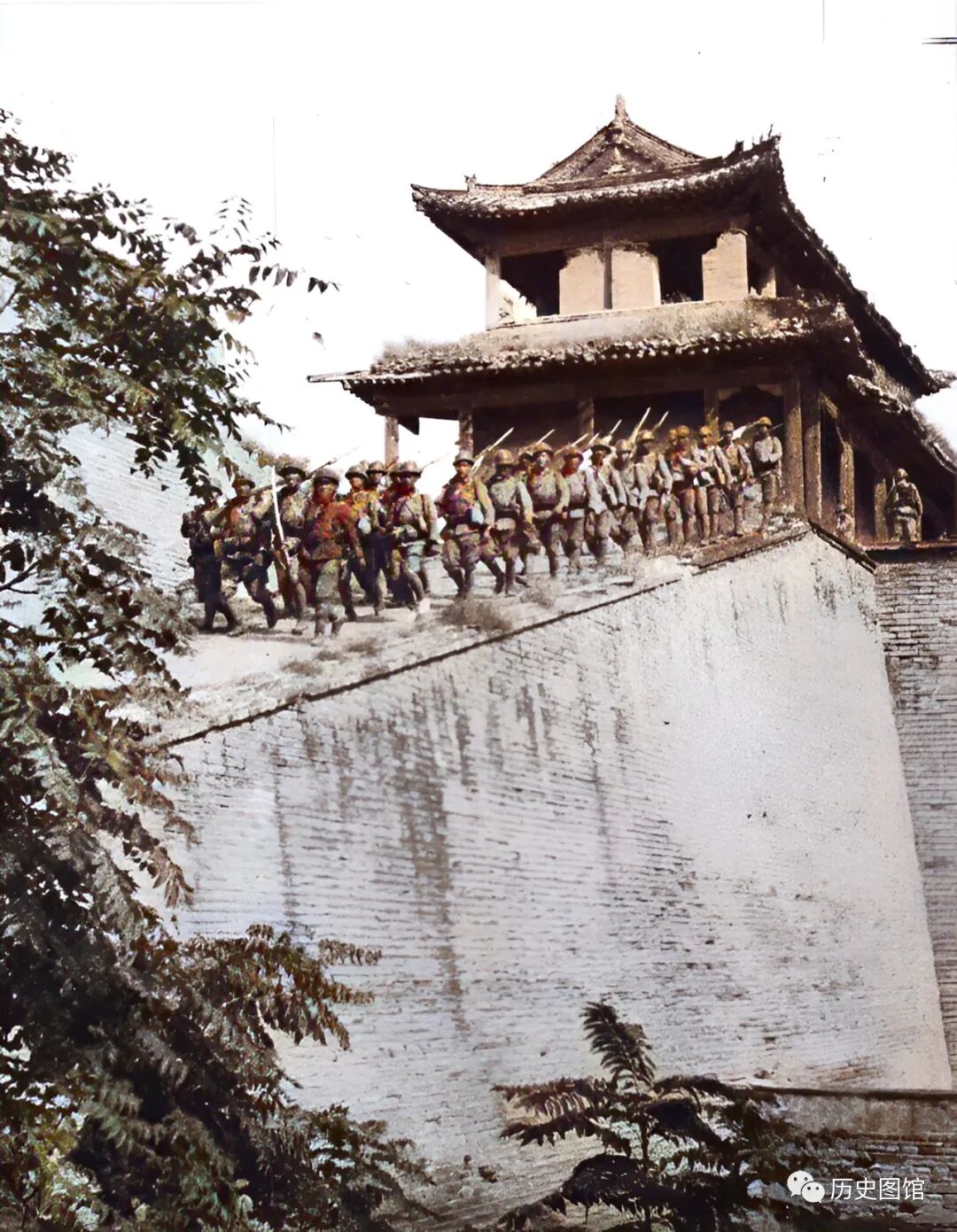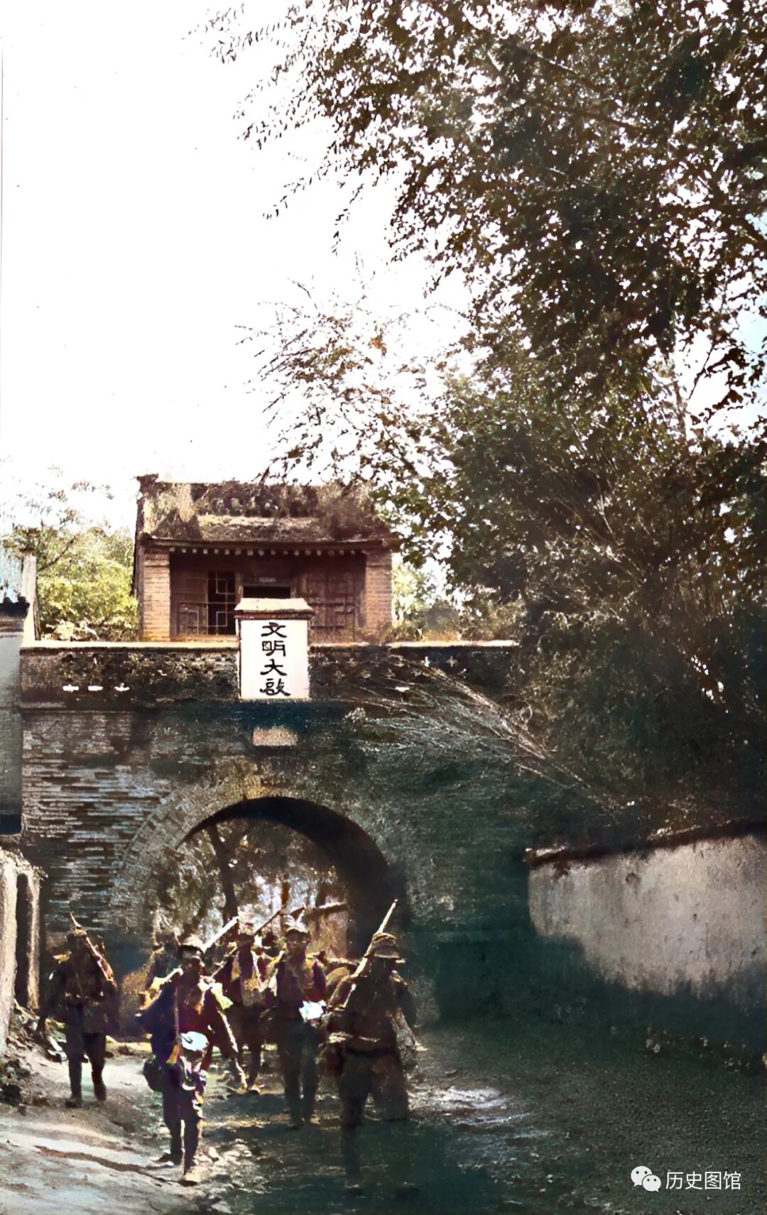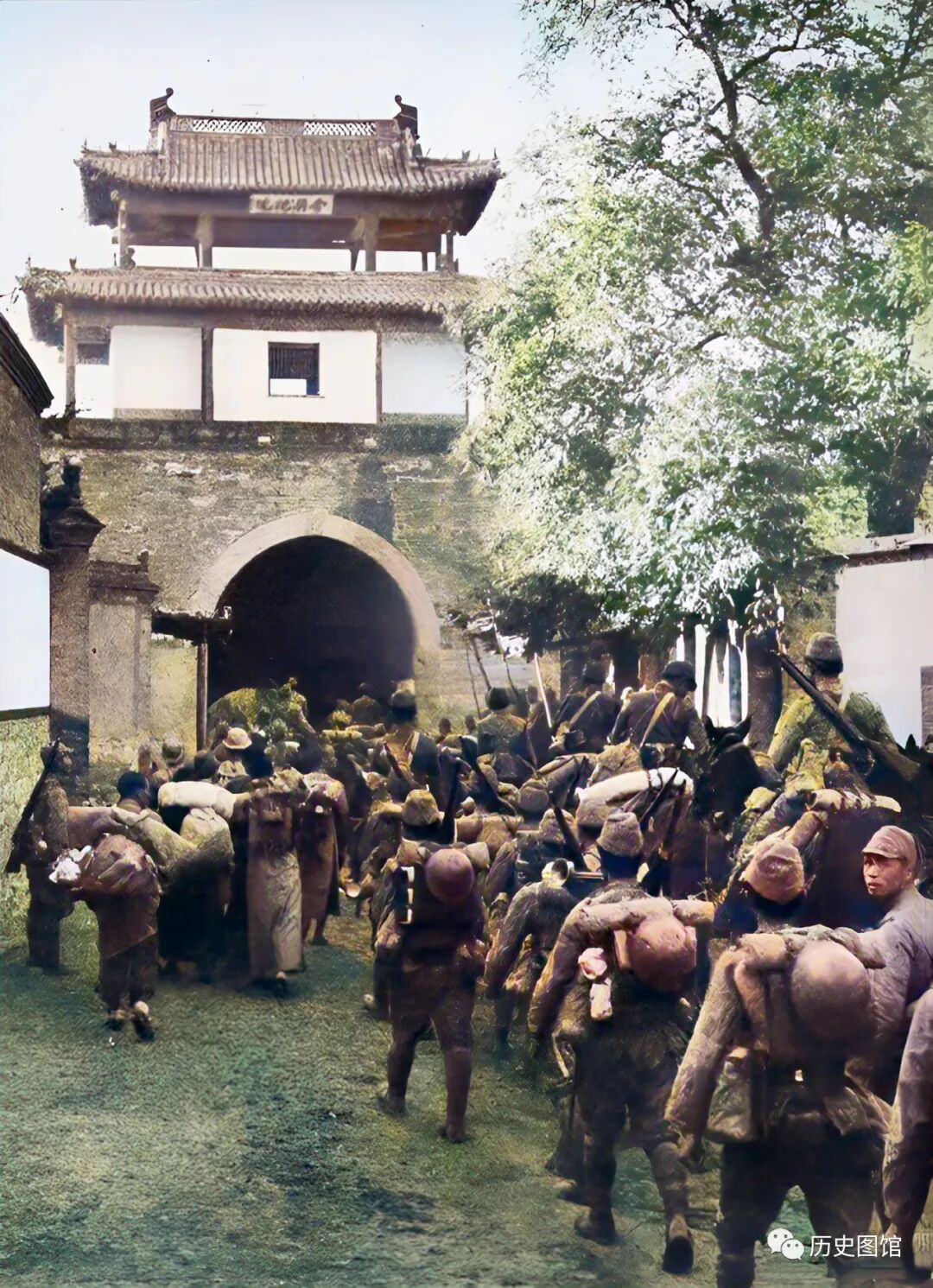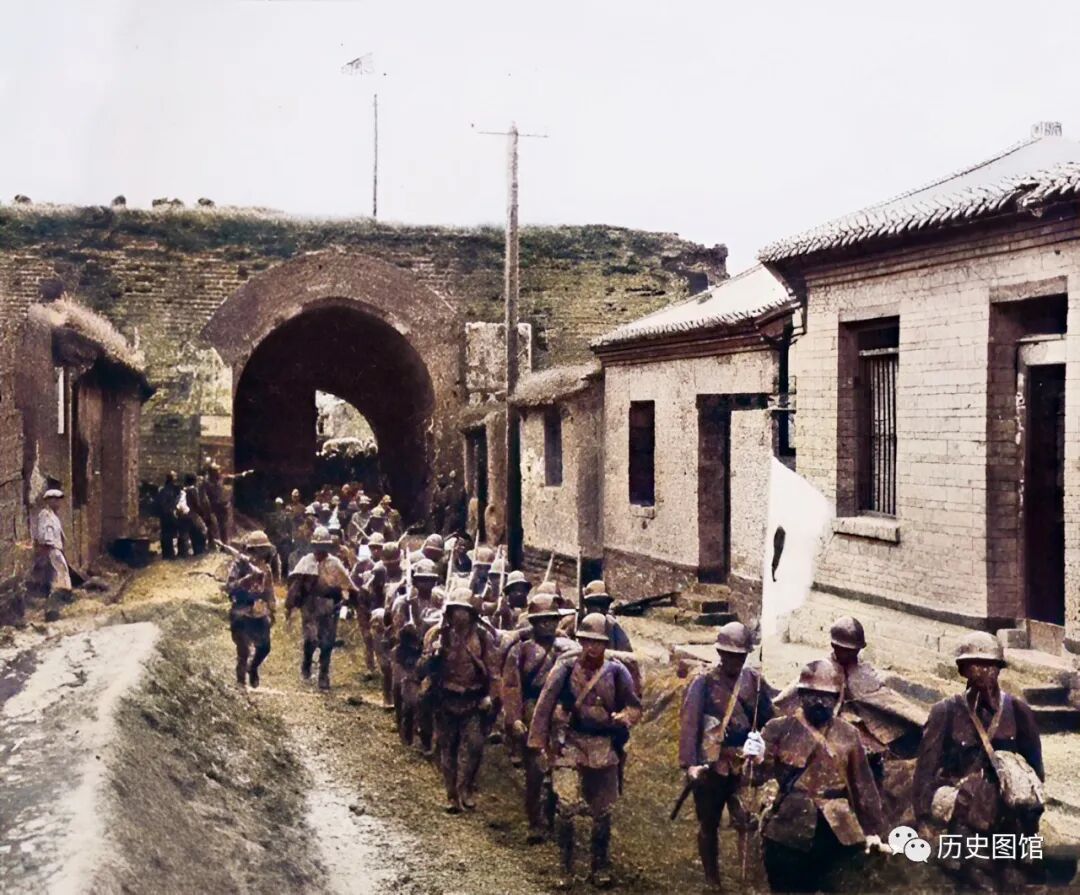 9月16日,日军在飞机和坦克的掩护下,进攻河北石楼村。这张照片拍摄于9月17日,日军一支先头部队,正在通过城门进入城内。