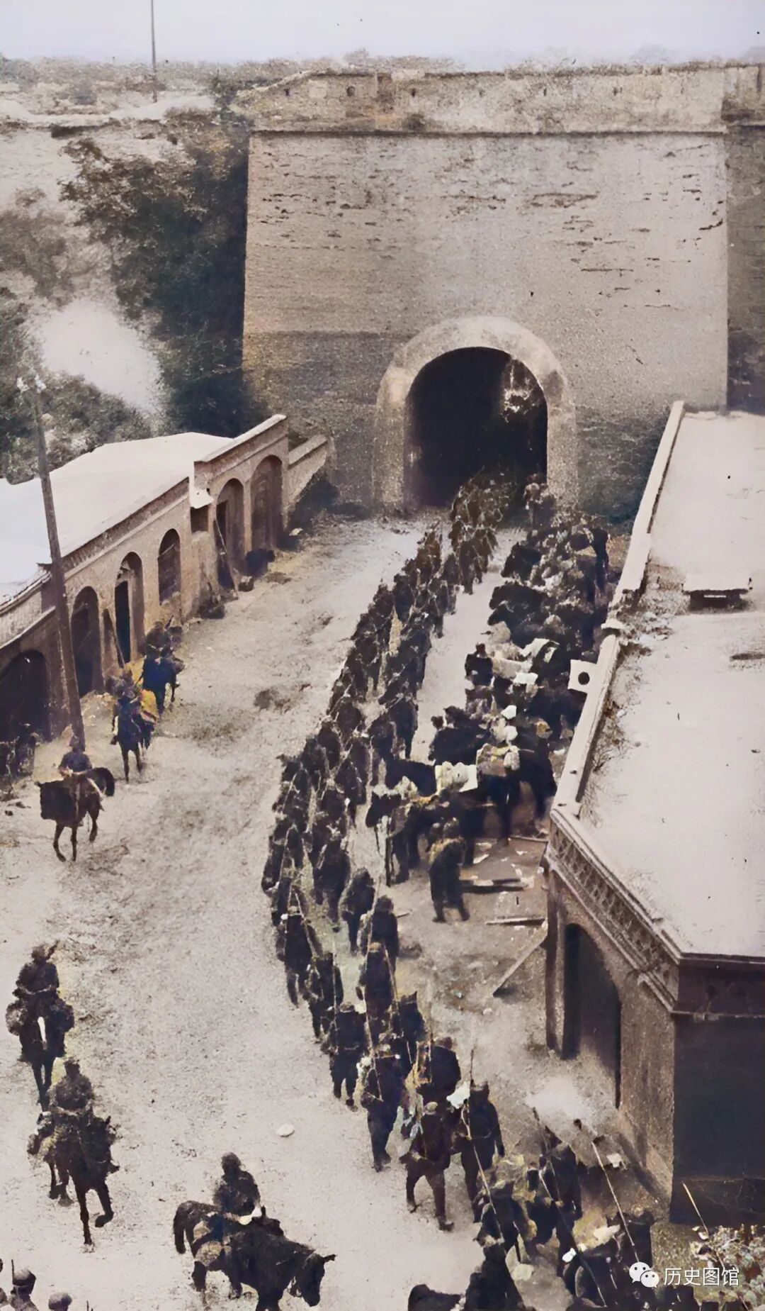 9月29日,河北献县被日军攻陷,日军片桐部队士兵正排着队从南门入城。骑在马上的日本军官耀武扬威。