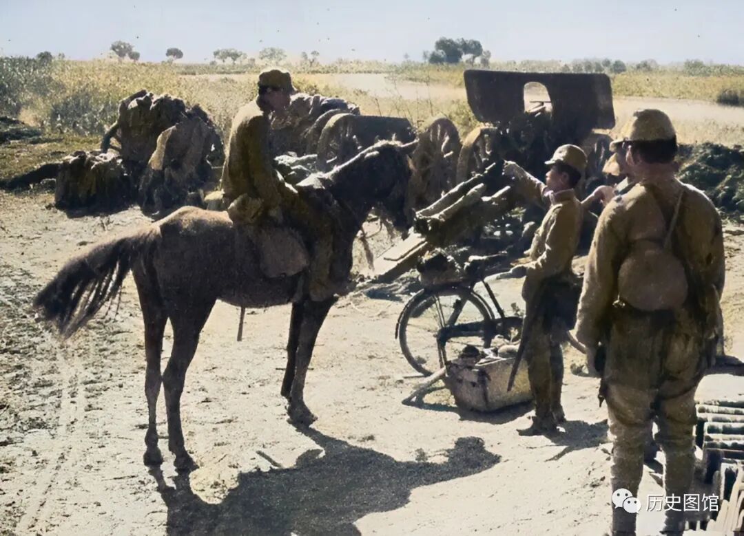 9月22日,河北沧州城外,日军的炮兵部队正在朝中国军队阵地发射炮弹。不远处,田地里的庄稼即将成熟。日军炮兵阵地就设在田地边上。一名骑马的日本军官来到阵地上视察。