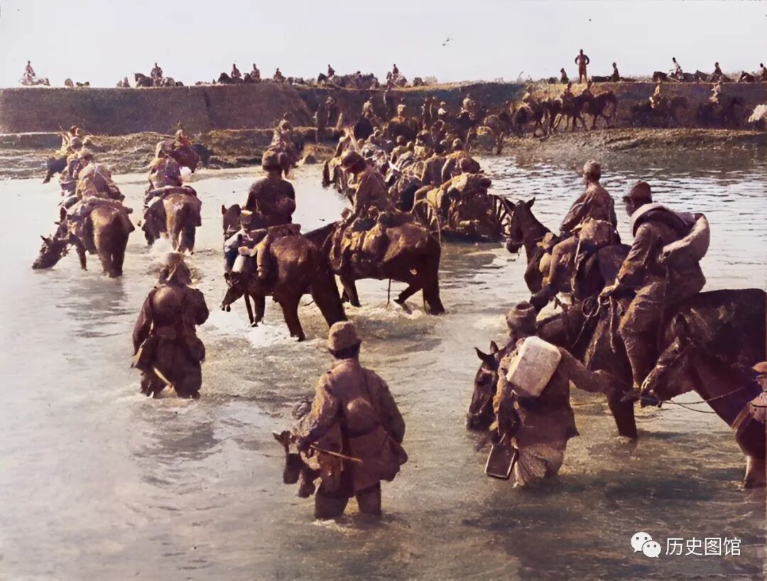 日军一支部队正在渡过大册河(徐河),士兵和马匹趟过河水到达对岸。这张照片,是日军战地摄影师拍摄的,拍摄于9月23日。