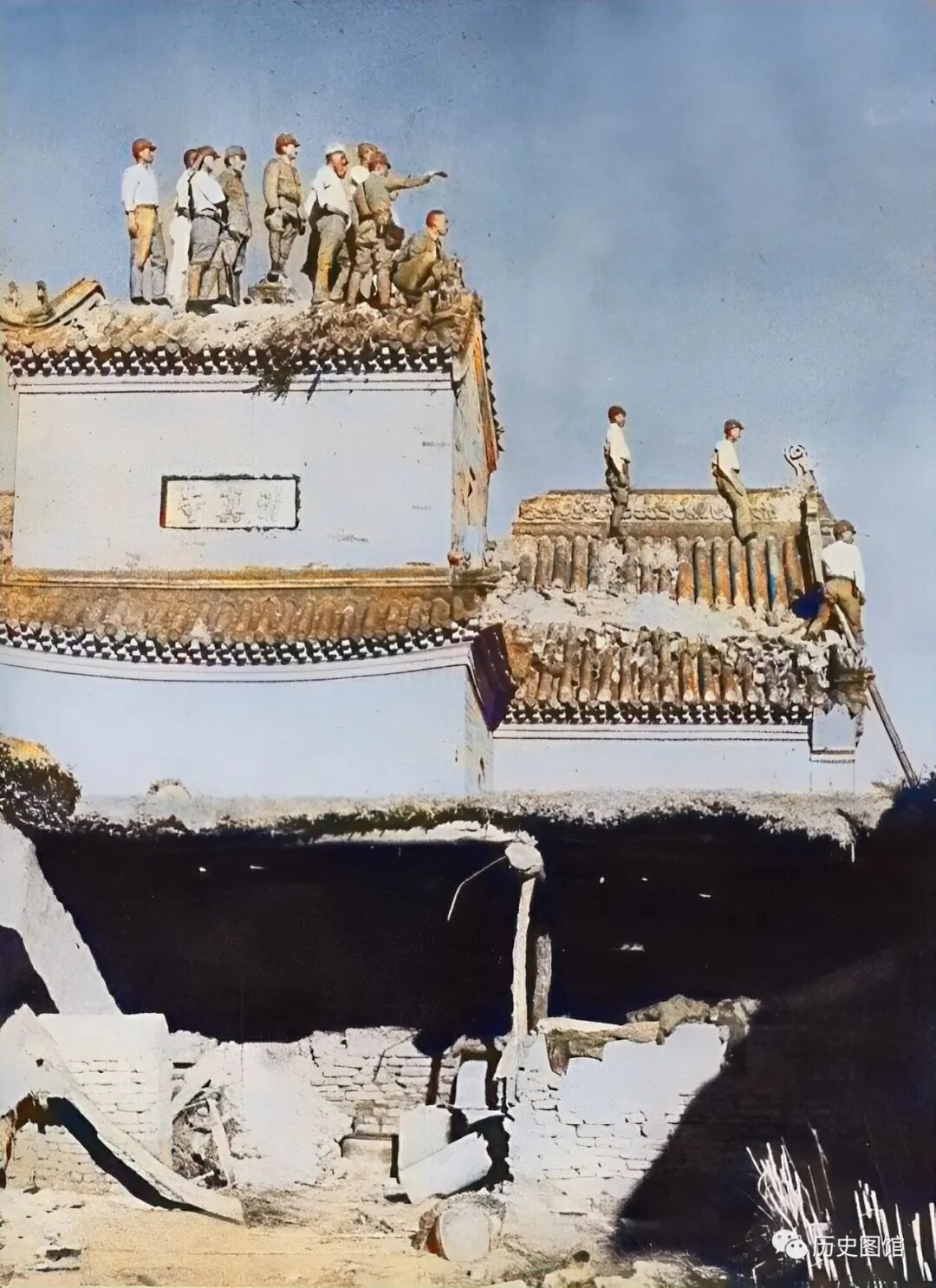 9月21日,日军占领河北沧州兴济镇,日军进城后,几名日本军官站在城中最高的建筑上,俯瞰沧州兴济镇。