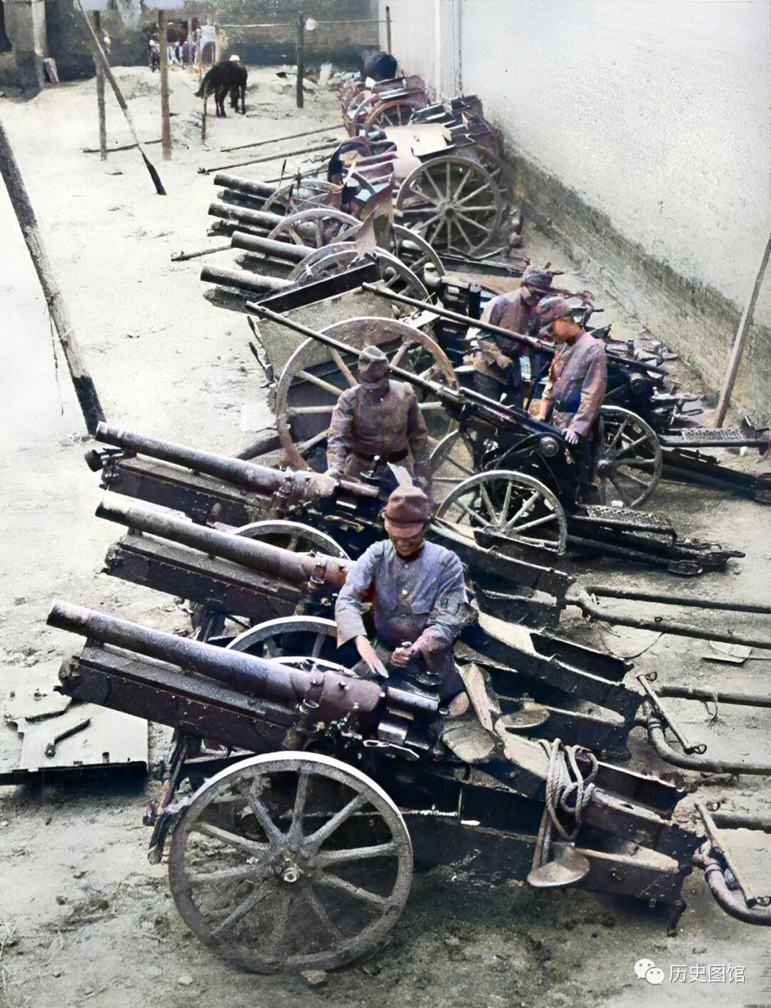 9月29日,在保定城内一个大院子里,日军正在检查缴获的大炮等武器装备,这些装备很多都是先进的德系装备。