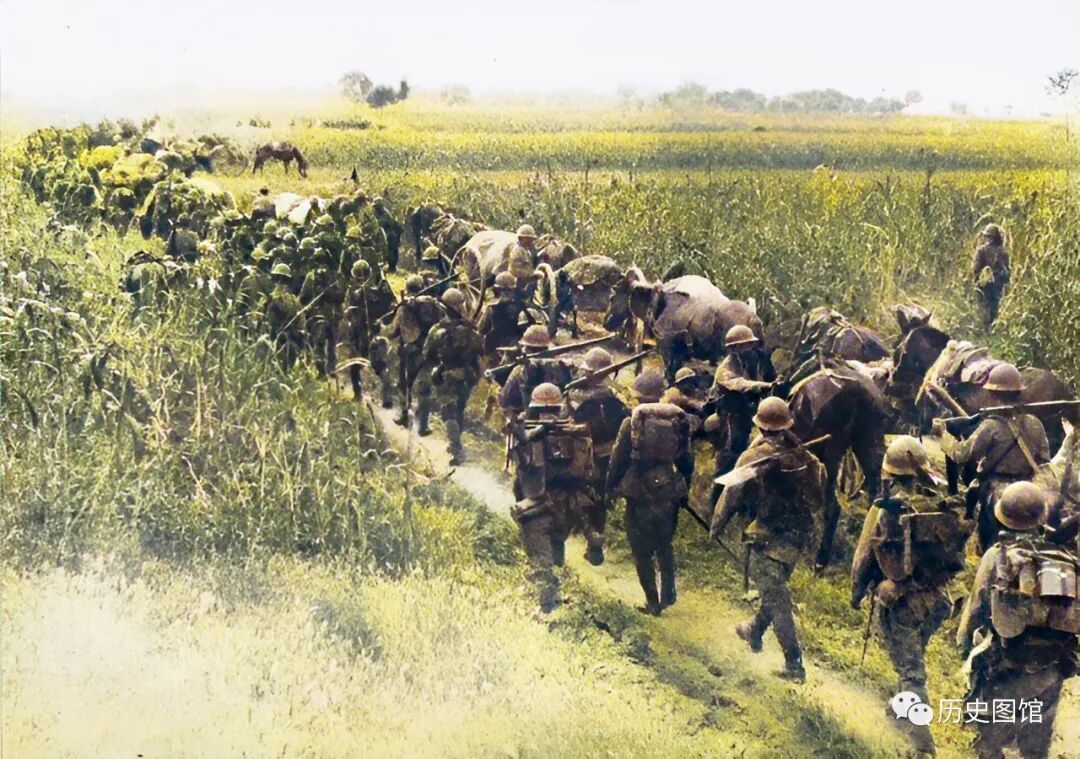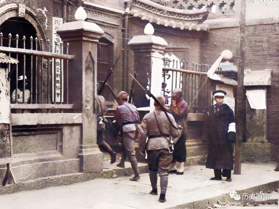 一名日军军官举着军刀,走在最前面,后面的士兵扛着上了刺刀的步枪。这应该是日军正在巡逻。
