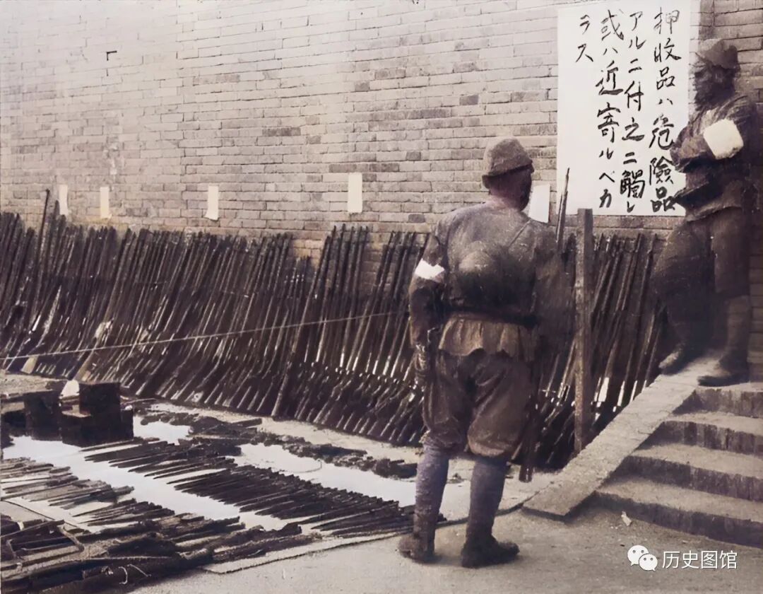 日军攻占河北保定后,将缴获的枪支等武器集中展示,并拉起了警戒线,两名日本宪兵正在现场把守。