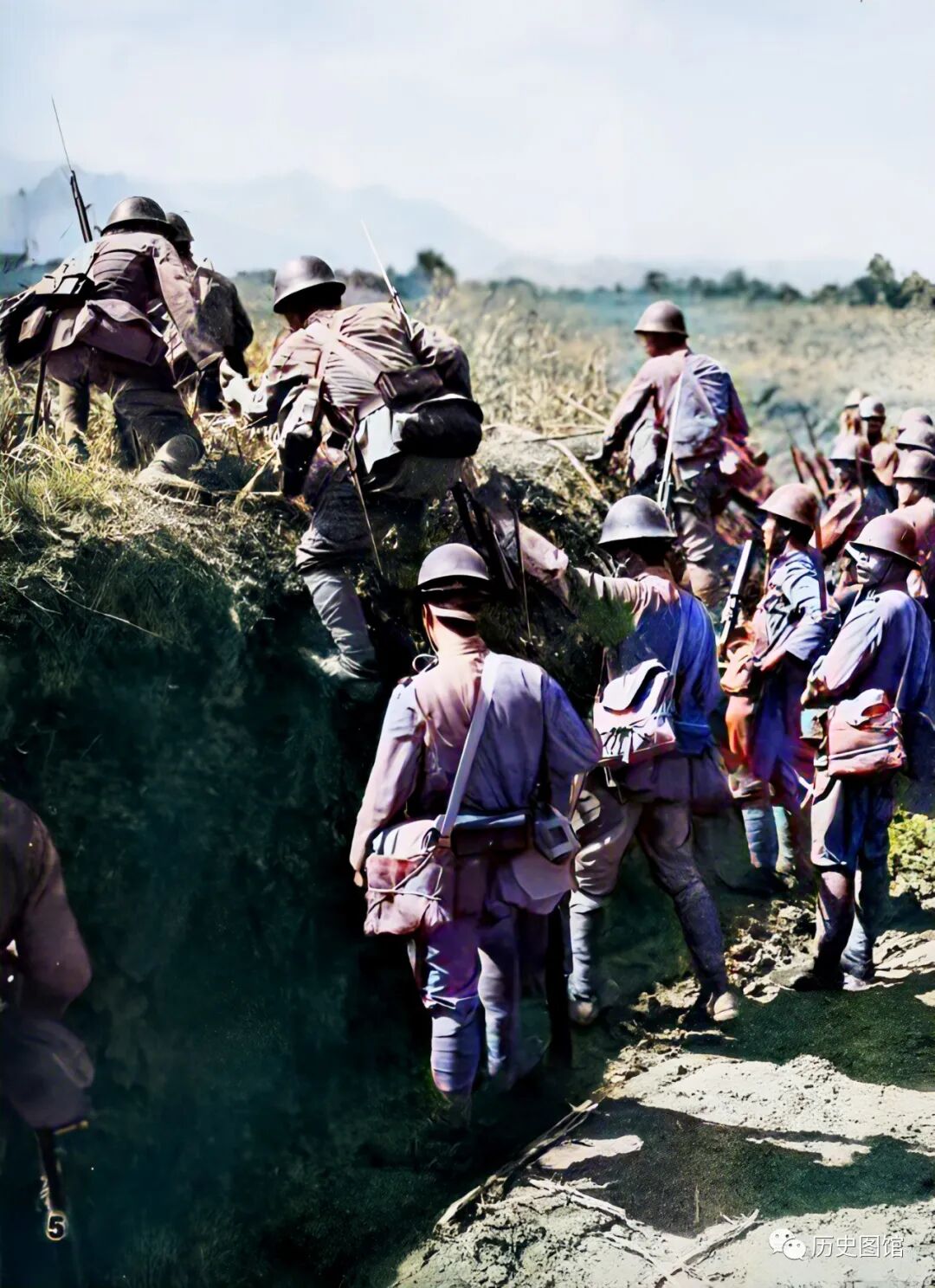 9月10日,一股日军进犯平汉线铁路,他们正在翻越一处战壕。参照战壕的高度和这些日军,日军的身高大部分在一米五左右。
