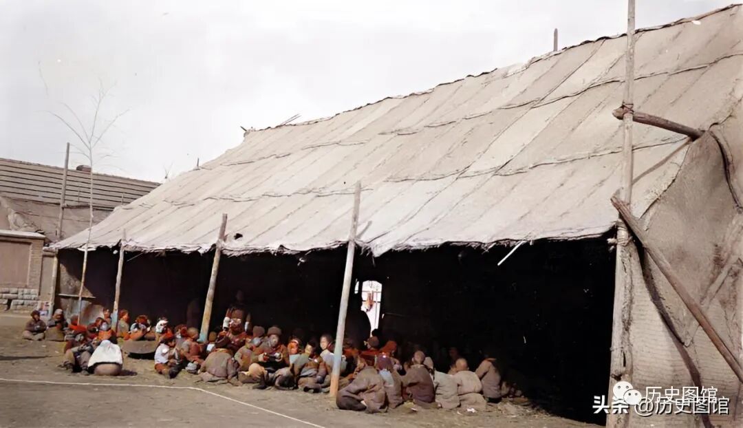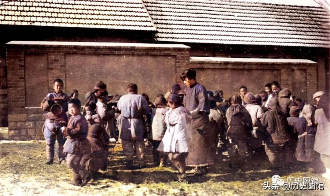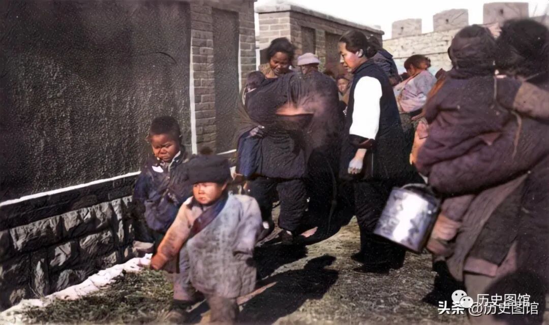 1928年,在齐鲁大学难民点前,难民们手拿器物,正在等待领取救济。她们面黄肌瘦,身上穿着破旧的棉衣,眼神中流露着对苦难生活的不屈和坚毅。