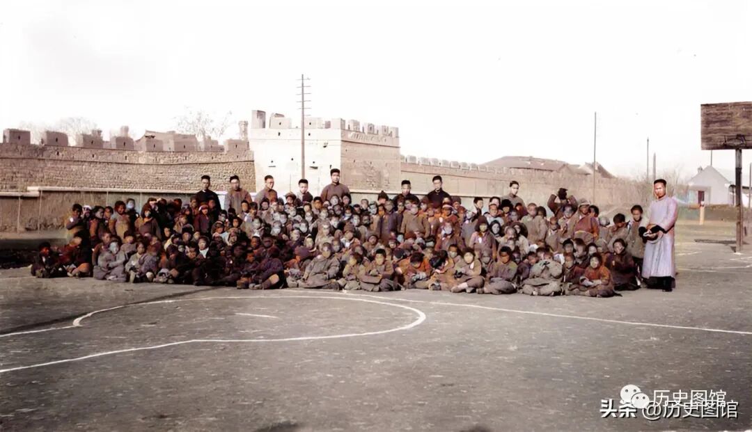 做完游戏,几名教授和孩子们在草丛上合影留念。地面上有白石灰画的场地线。操场不远处,还能看到高大的篮球架。这样的场面,很难让人相信拍摄于1928年的济南大饥荒中。