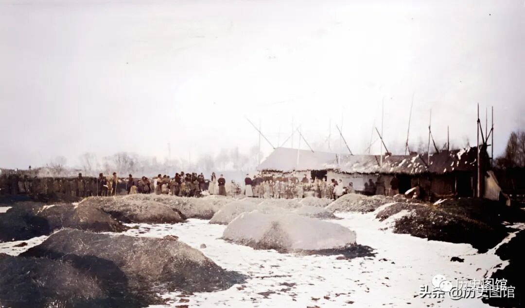 这座临时搭起的草房,是难民营里的食堂。中午时分,居住在附近窝棚里的灾民们,正排着队领取少量的饭食。这是个寒冷的冬天,地上的雪还没有完全融化。