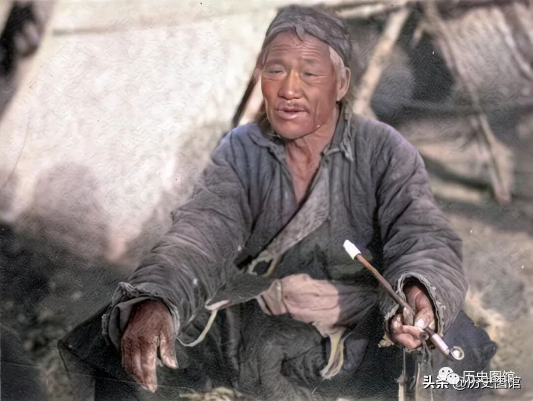 一名老者,手里拿着烟袋锅,坐在窝棚前面。他身材销售,衣服也很破旧。面对灾情,他显得十分的无助,对未来生活更是充满了不肯定。