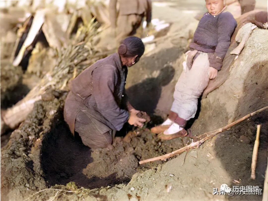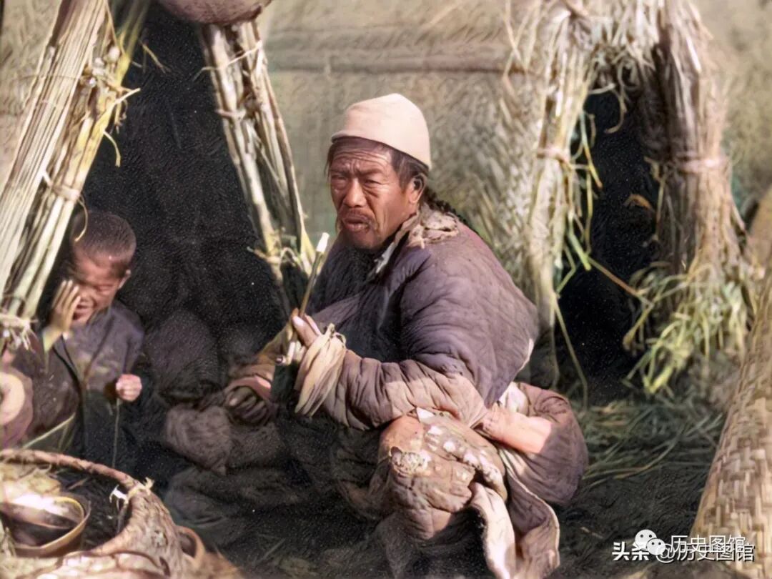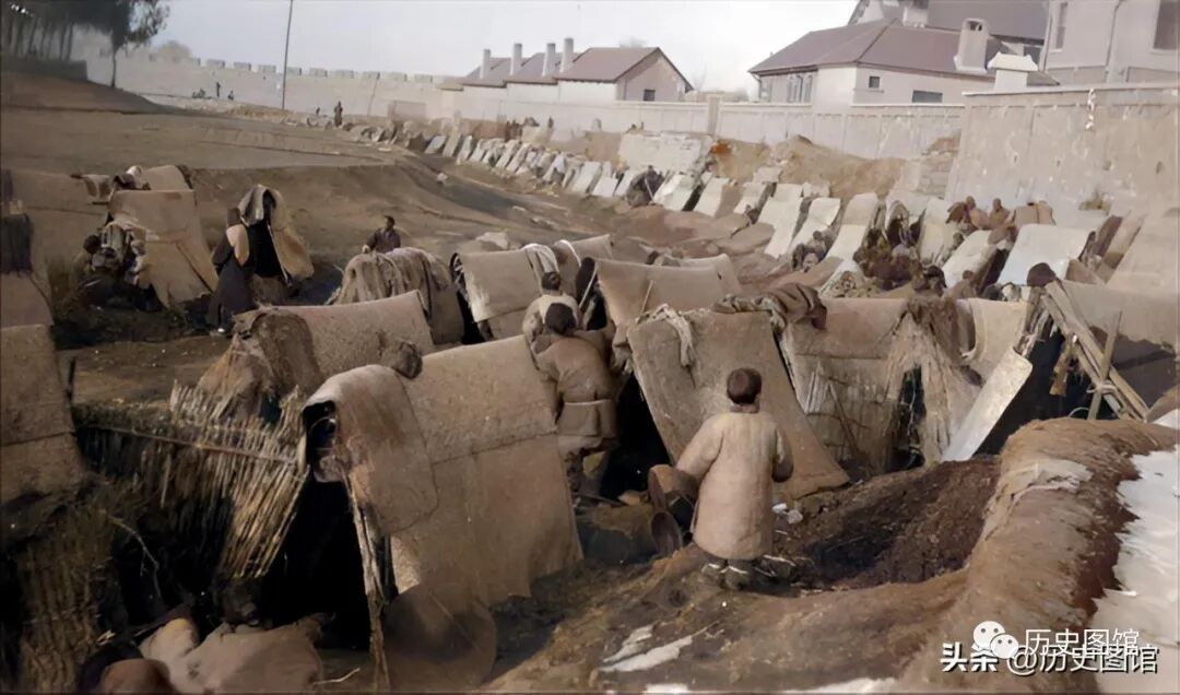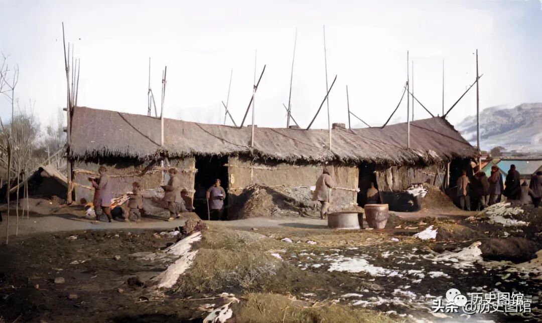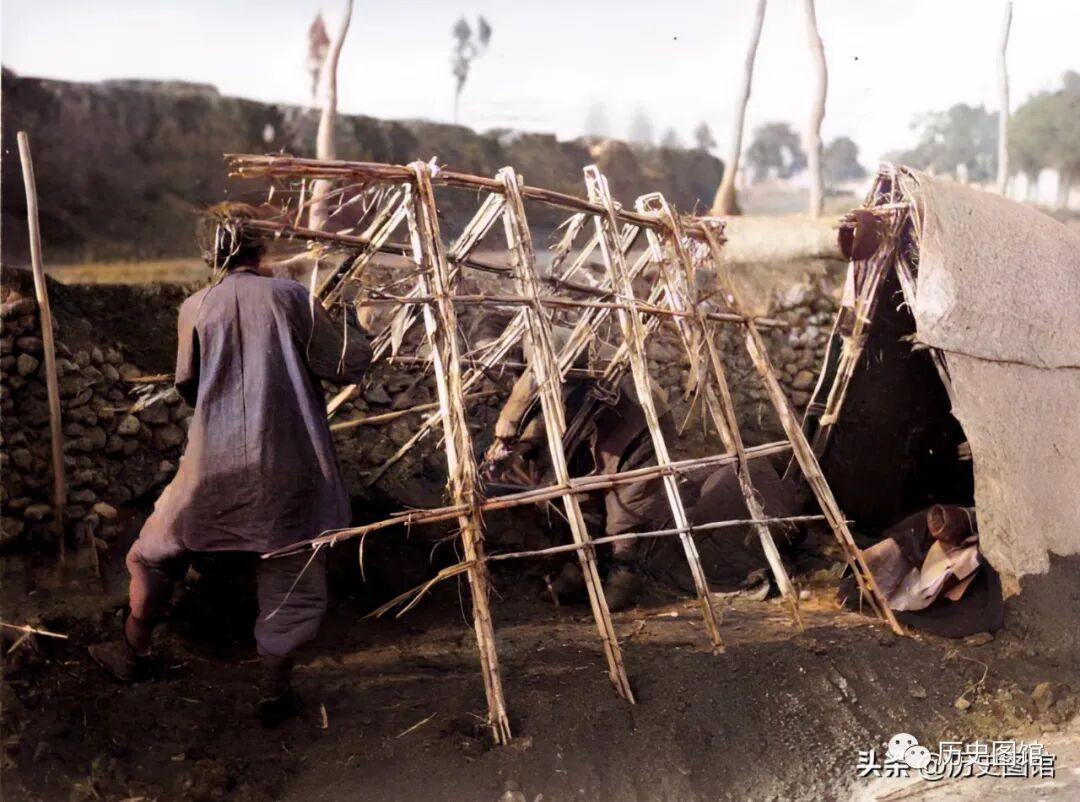 这张照片,清楚地显示了灾民们搭建窝棚的全过程。两名妇女先用土堆起高台,这样可防止雨水倒灌。再用高粱杆扎起窝棚的骨架。最后,在上面覆盖上席子。