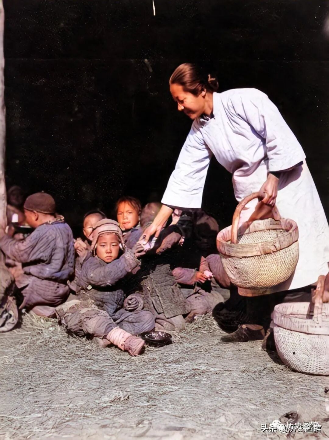1927年冬季,济南。前来帮助难民的齐鲁大学学生会主席。她带领学生会成员来到孩子们中间,为他们送来食物和糖果。孩子们簇拥在她们周围,场面很是温馨感人。