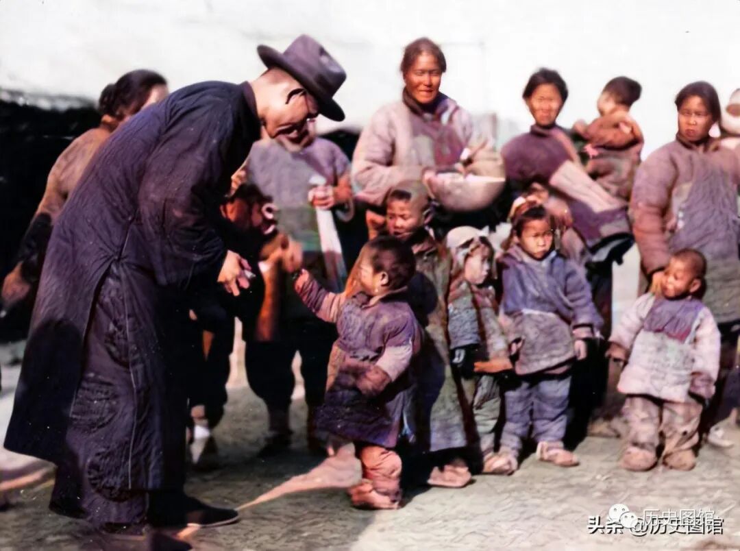 在这场大饥荒,社会各界人士纷纷向灾民们伸出了援助之手。照片中,一名身穿长衫,头戴礼帽的教育工作者,也来到难民点慰问这里的灾民,他还向孩子们送去了糖果。