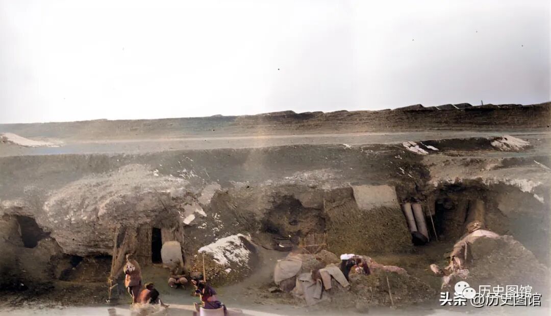 人们为了生活,有的人搭起了简易的窝棚。有的人则在土崖上开凿窑洞作为栖身之地。照片中,这两户人家,已经在窑洞里生活了很久。太阳出来了,他们坐在窑洞前晒太阳。